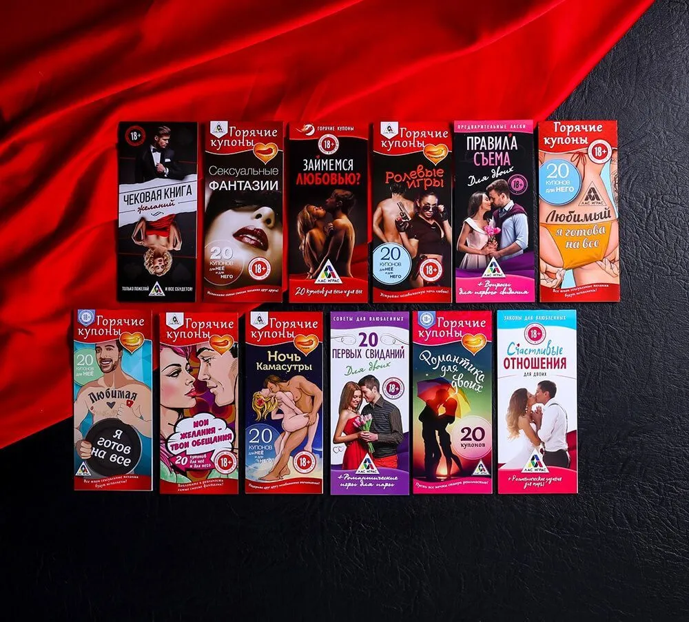 Набор из 12 разных комплектов купонов позволит Вам добавить романтики в отношения и осуществить свои самые сокровенные желания. Правила просты - выберите понравившийся купон и вручите его своей второй половинке. Каждый купон может стать для Вас неожиданным, но приятным сюрпризом, поэтому не бойтесь воплощать свои желания в жизнь. Выбирайте любой понравившийся план событий и дарите друг другу страстное наслаждение или проведите вдвоем вечер, наполненный нежностью и любовью!