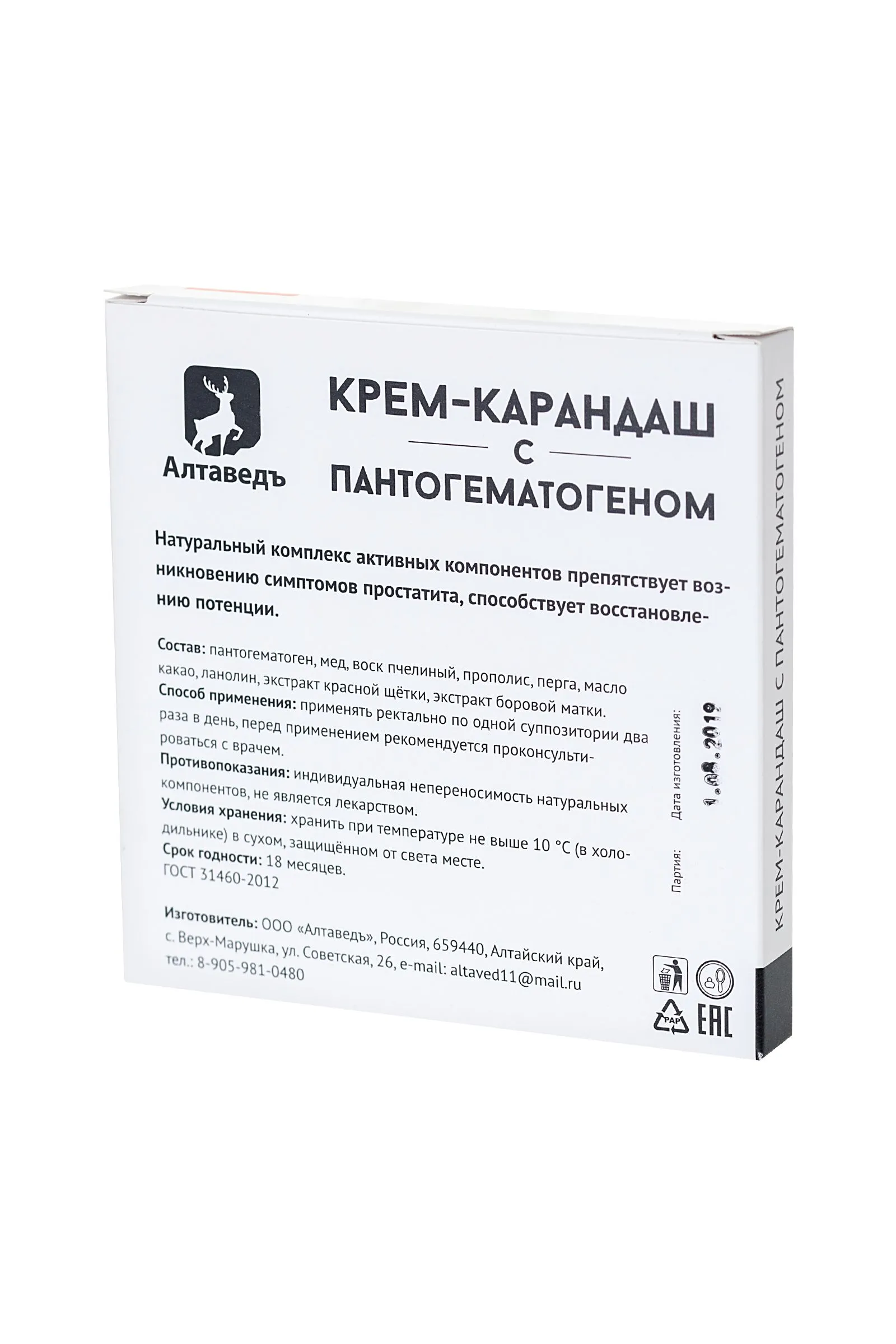 Крем-карандаш с пантогематогеном — натуральный комплекс активных компонентов, который препятствует возникновению симптомов простатита, купирует воспалительные процессы и способствует усилению потенции. • Дополнительные свойства: обладает обезболивающим действием, является эффективным средством при геморрое, может использоваться как натуральный лубрикант. • Основной компонент пантогематоген отвечает за восстановление внутренних резервов организма, снятие синдрома «хронической усталости», нормализацию обмена веществ и повышение иммунитета. • Полностью натуральный состав: пантогематоген, мед, пчелиный воск, прополис, перга, масло какао, экстракт красной щетки, экстракт бобровой матки — сырье, используемое при производстве этого крем-карандаша выращено в экологически чистых предгорьях Алтая. «АлтаВедъ» — с заботой о вашем здоровье.