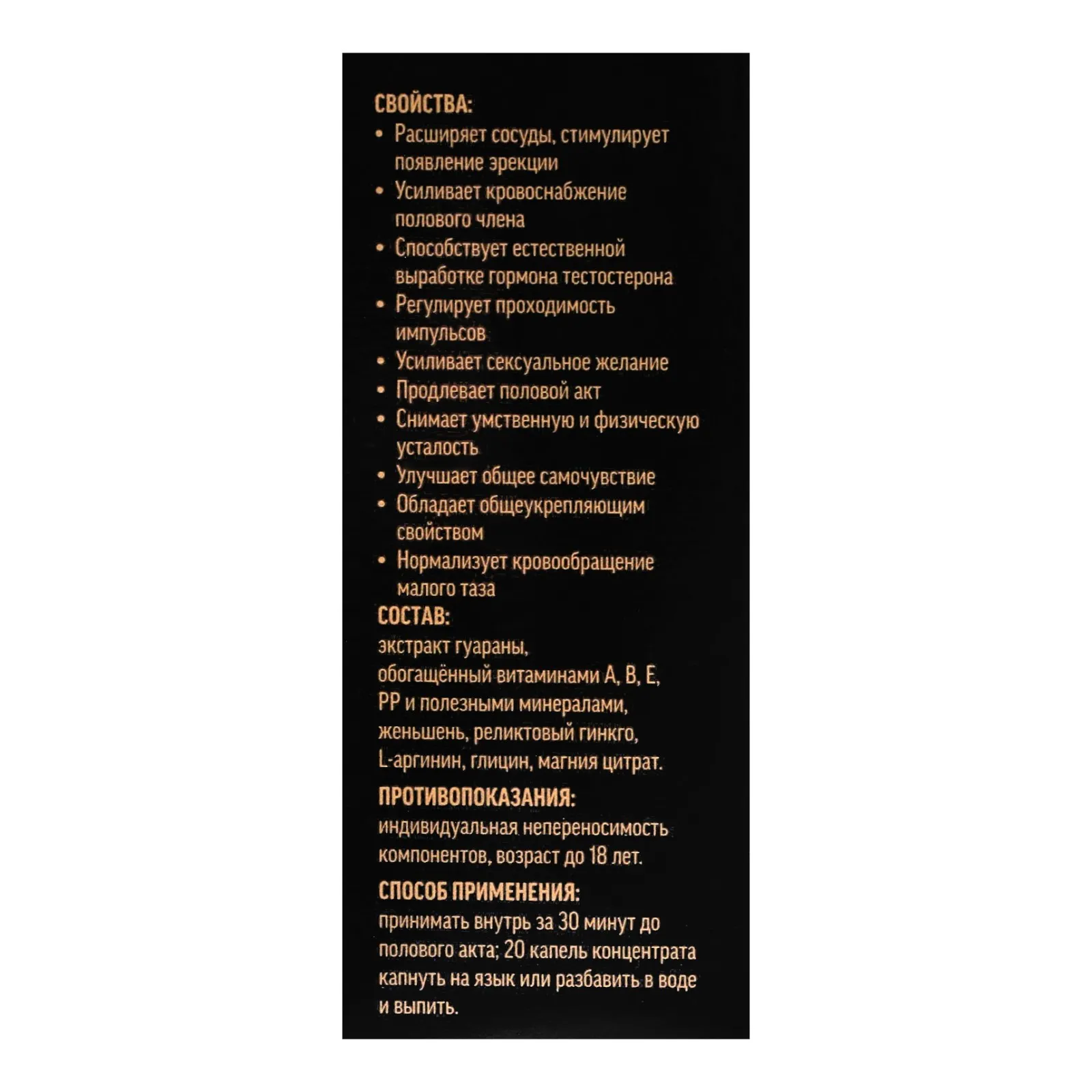 принимать внутрь за 30 минут до полового акта; 10 капель препарата разбавить в воде и выпить или капнуть на язык.