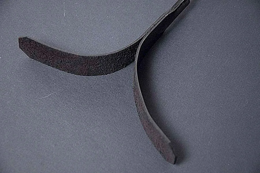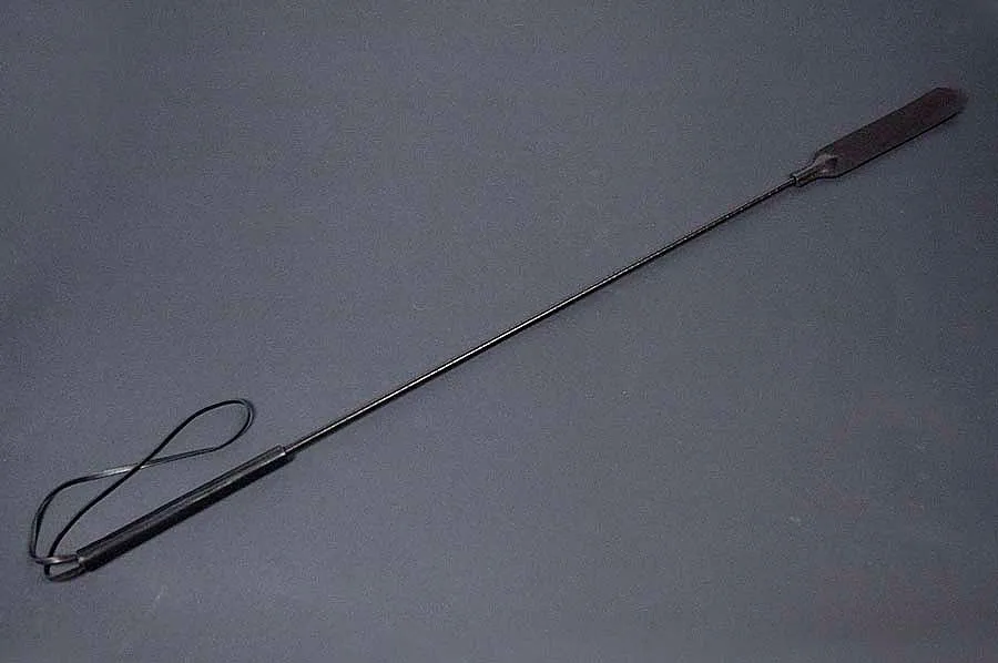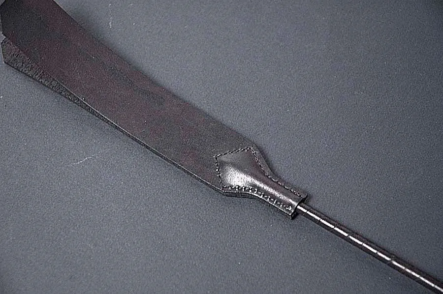 Стек с фигурным шлепком из 2-х "прямоугольников со скошенными углами". Длина "прямоугольников" 160 мм, ширина 27 мм. Основание стека обвито кожей. Ручка стека обтянута кожей, с петлей для подвеса.