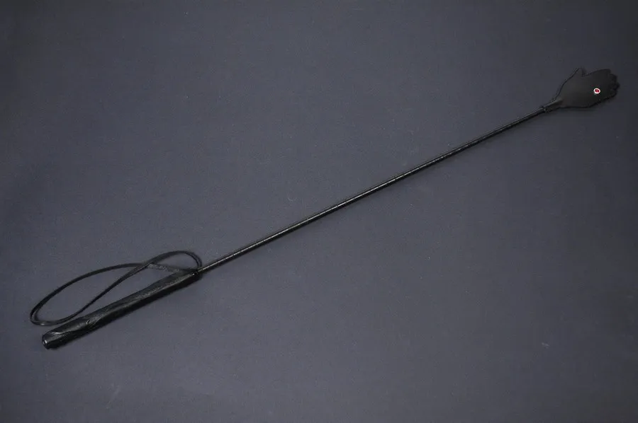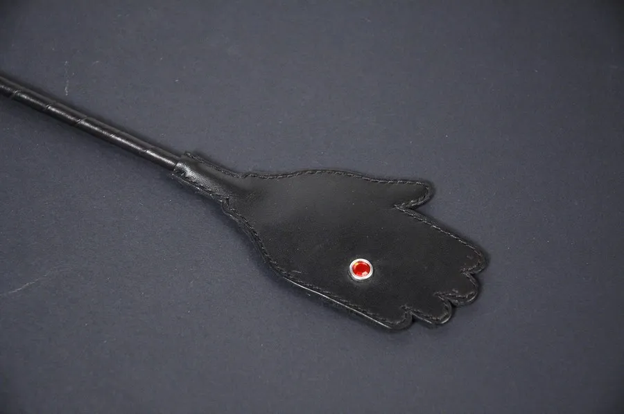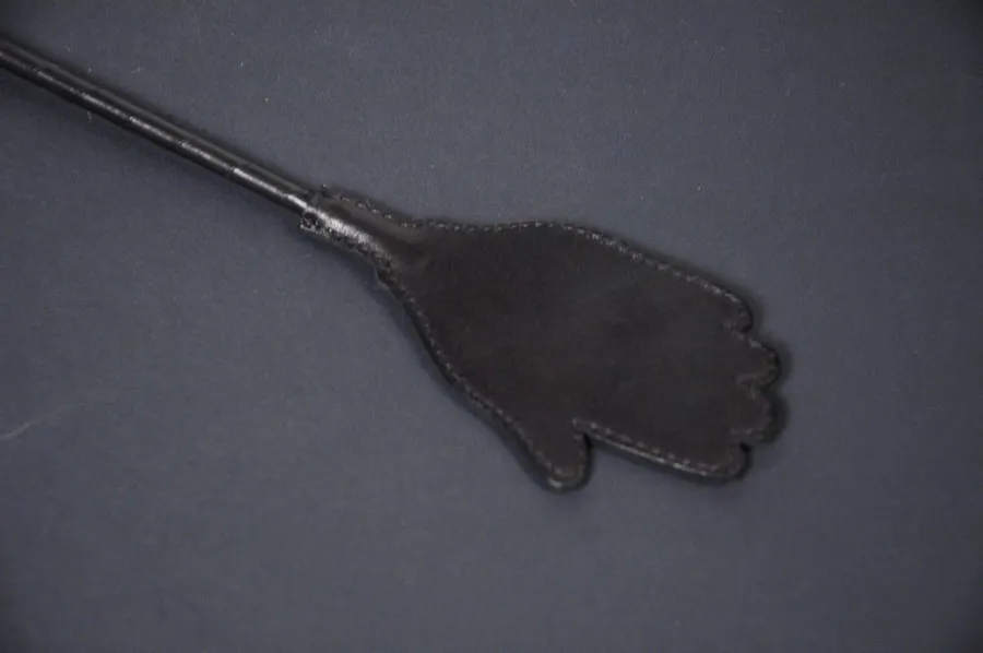 Стек обтянутый кожей со шлепком "ладонь с перстнем". Ручка с петлей для фиксации руки, основание обвитое кожей, на конце с фигурным шлепком 120 мм.
