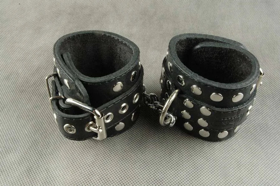 Наручники подшитые черным велюром, зафиксированные между собой сварной цепочкой длиной 140 мм. Прямоугольная база шириной 65 мм, с центральным ремнем шириной 25 мм поверх базы, с декоративной металлической фурнитурой по краю. По центру наручников сварное D-кольцо, зафиксированное хольнитенами. Застежка, с регулирующим размер ремешком и пряжкой, проходит поверх базы. Наручники подойдут для запястья с обхватом от 140 мм до 220 мм.