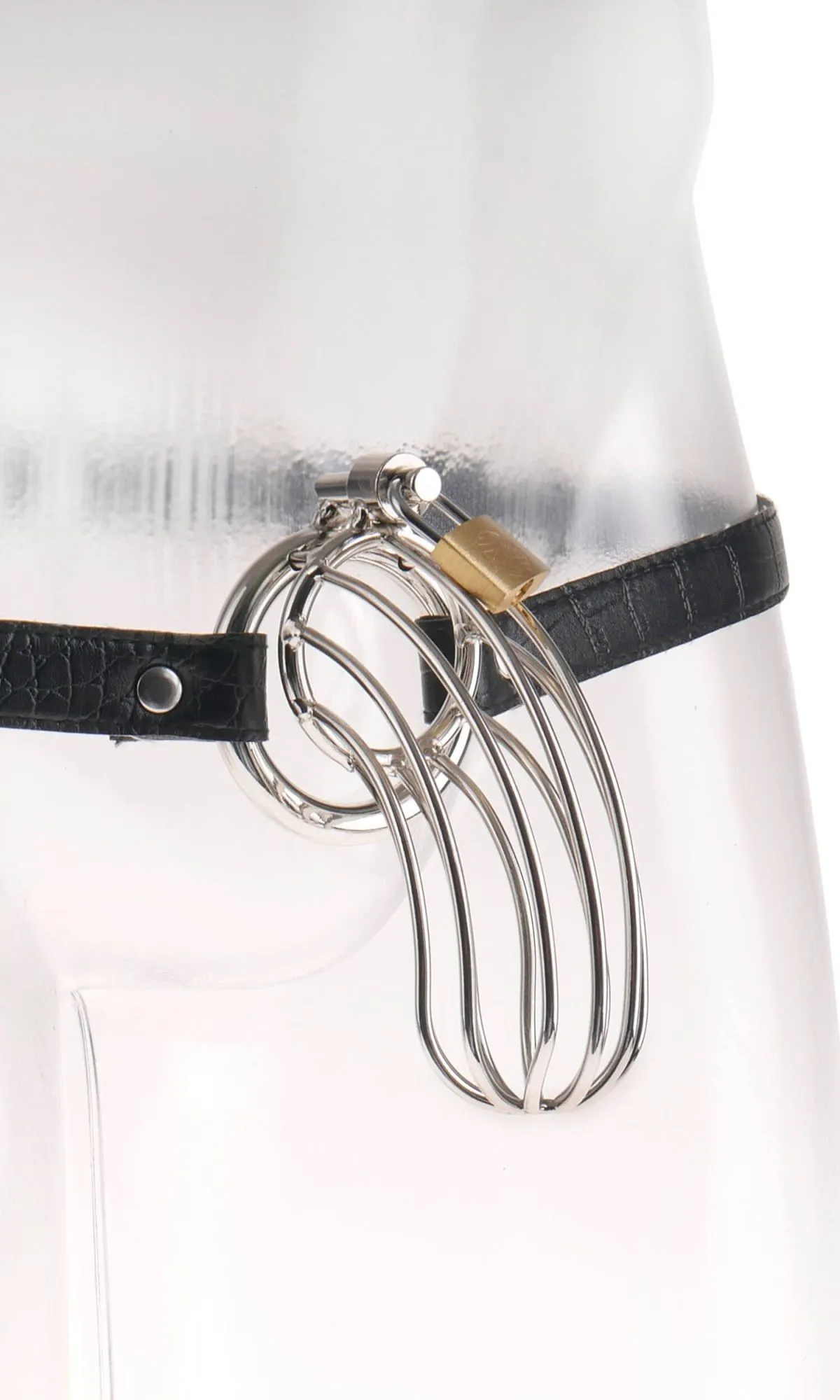 Клетка пояса верности сделана из стали, а черный ремешок из винила с принтом под крокодила. Ремень регулируется под нужный размер. Надевать клетку следует на неэрегированный член и использовать при этом лубрикант. Благодаря отверстиям будет возможность для соблюдения гигиены.