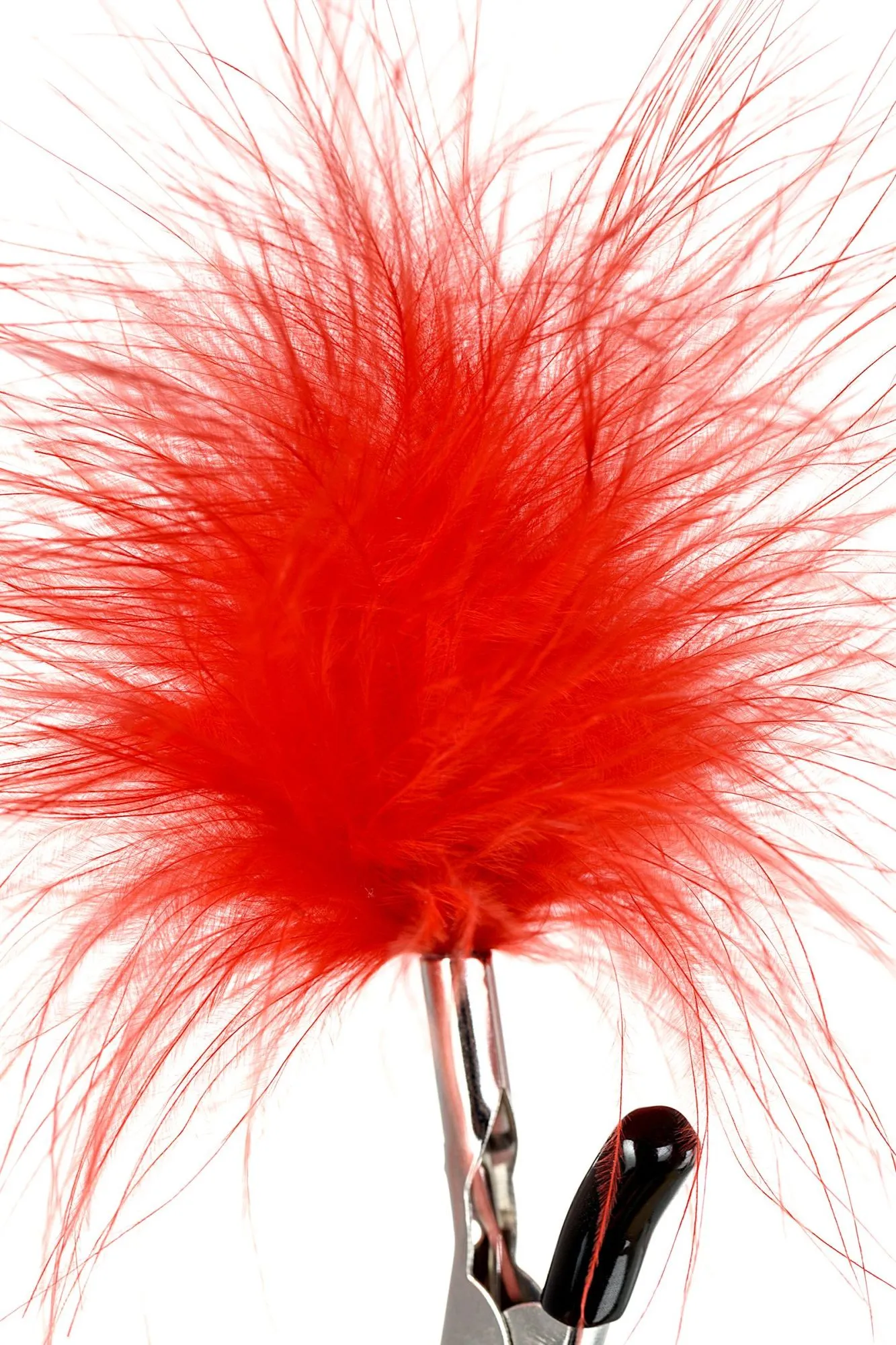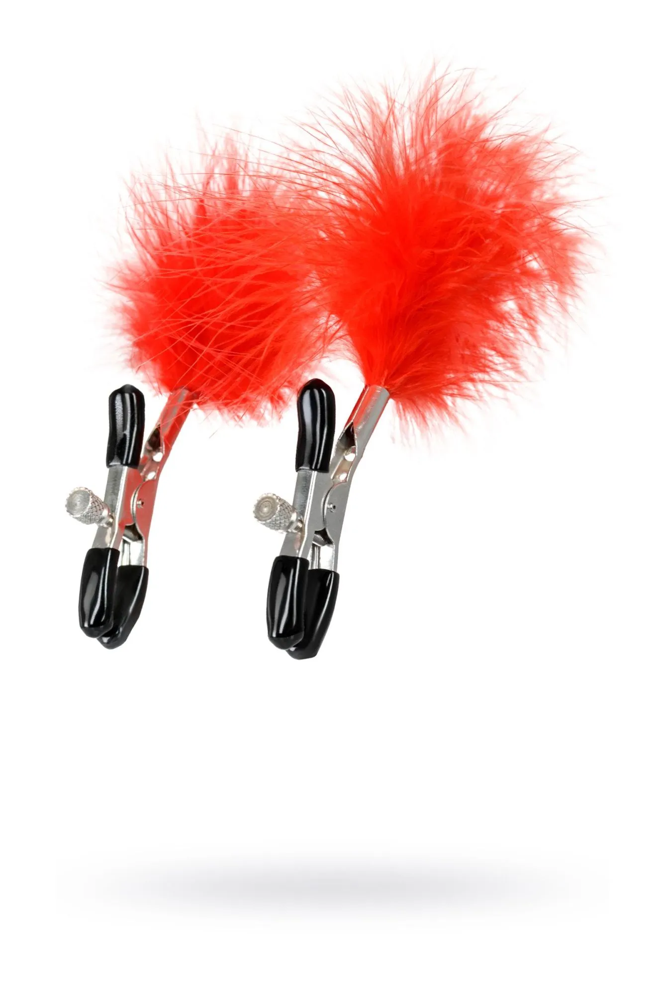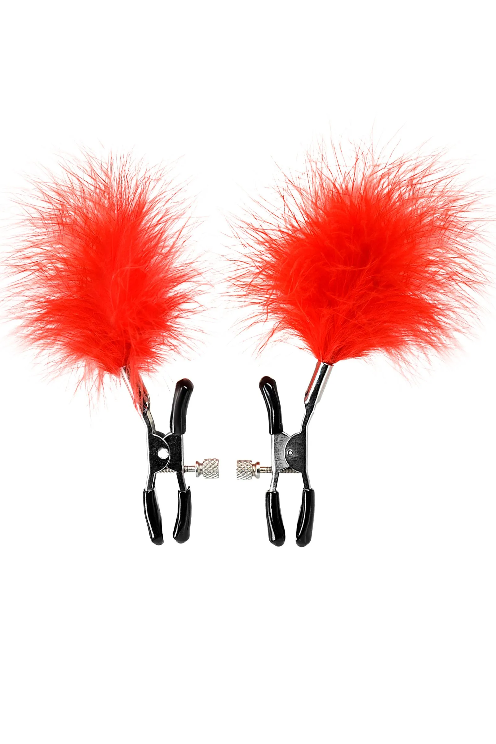 Пожалуй, самые милые из всех зажимов - украшенные перьями. Они стимулируют не только сжатием сосков, но и щекочут грудь. Сдавливание регулируется болтиком и может быть усилено или уменьшено во время интимной игры. Покрытие на концах зажимов защищает нежную кожу.