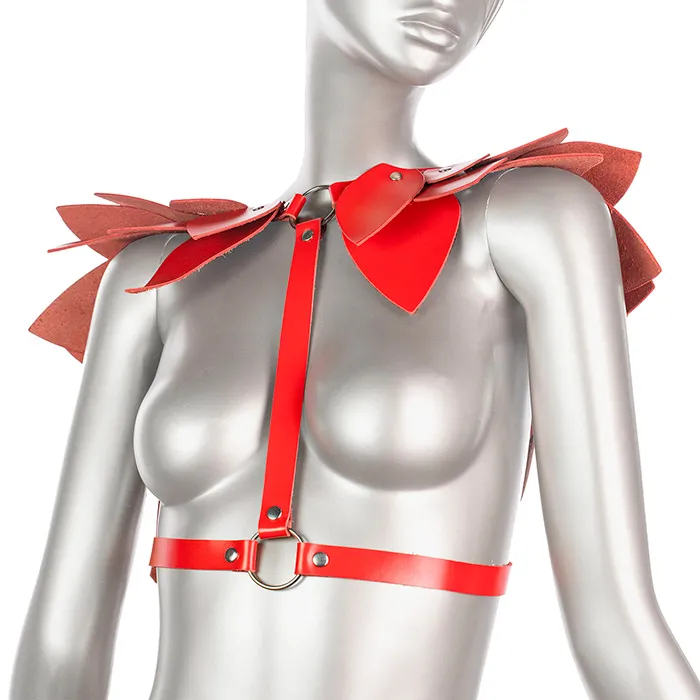 Ярко-красная кожаная портупея с крылышками на плечах - выразительный и привлекающий внимание аксессуар. Её можно носить в повседневной жизни, надевая поверх платья, рубашки или блузки. Или собрать идеальный кокетливый образ на тематическую или любую другую вечеринку. Все взгляды будет обращены на вас.