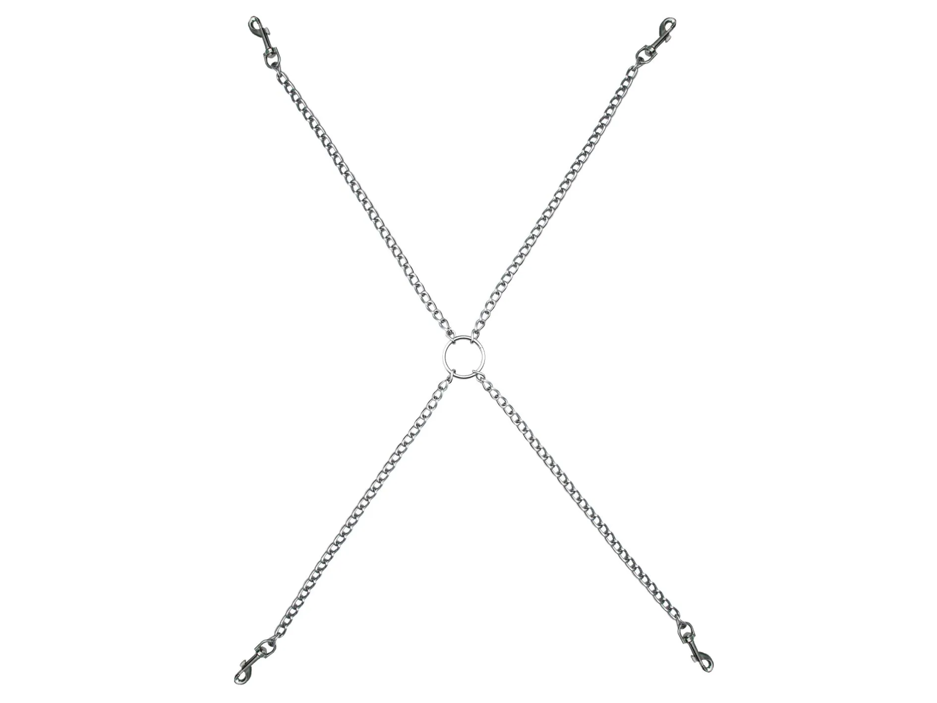 Цепь с центральным кольцом и четырьмя карабинами может использоваться для соединения наручников и поножей, а также других девайсов БДСМ-тематики. Она выполнена из прочного металла. Готовясь к жарким играм в стиле БДСМ, не стоит забывать о таких мелочах. Ведь надежное крепление имеет особое значение для комфорта и безопасности.