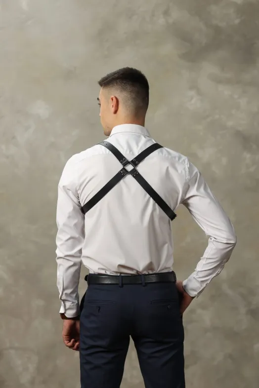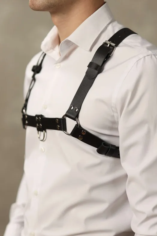 Стильная и необычная мужская портупея, полностью выполненная из натуральной кожи. Декорирована качественной металлической фурнитурой. Аксессуар двусторонний: его можно носить по разному, меняя положение по Вашему желанию. Стильный элемент для Вашего образа, который будет особенно эффектно смотреться на обнаженном мужском теле и возбуждать фантазию!