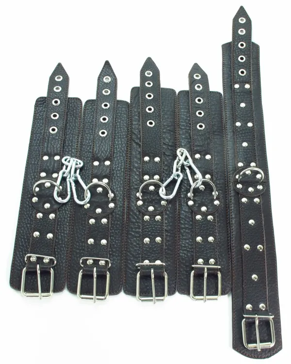 Набор аксессуаров, изготовленных из натуральной кожи коричневого цвета. В него входят: наручники и наножники, украшенные заклепками (ширина - 6 см), которые можно соединять и комбинировать между собой при попощи цепей с карабинами (входят в комплект). Размер меняется при помощи застежки. Так же имеется ошейник, шириной 5 см, с одним кольцом. Размер регулируется застежкой.