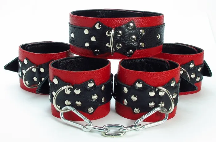 Набор аксессуаров, изготовленных из натуральной кожи. В него входят: наручи и поножи, украшенные заклепками (ширина - 6 см), которые можно соединять и комбинировать между собой при попощи цепей с карабтинами (входят в комплект) Размер меняется при помощи застежки. Так же имеется черно-красный ошейник, шириной 5 см, с одним кольцом. Размер регулируется застежками.