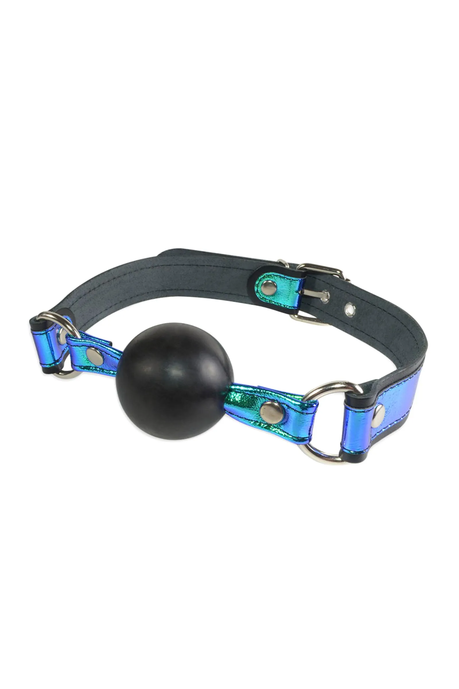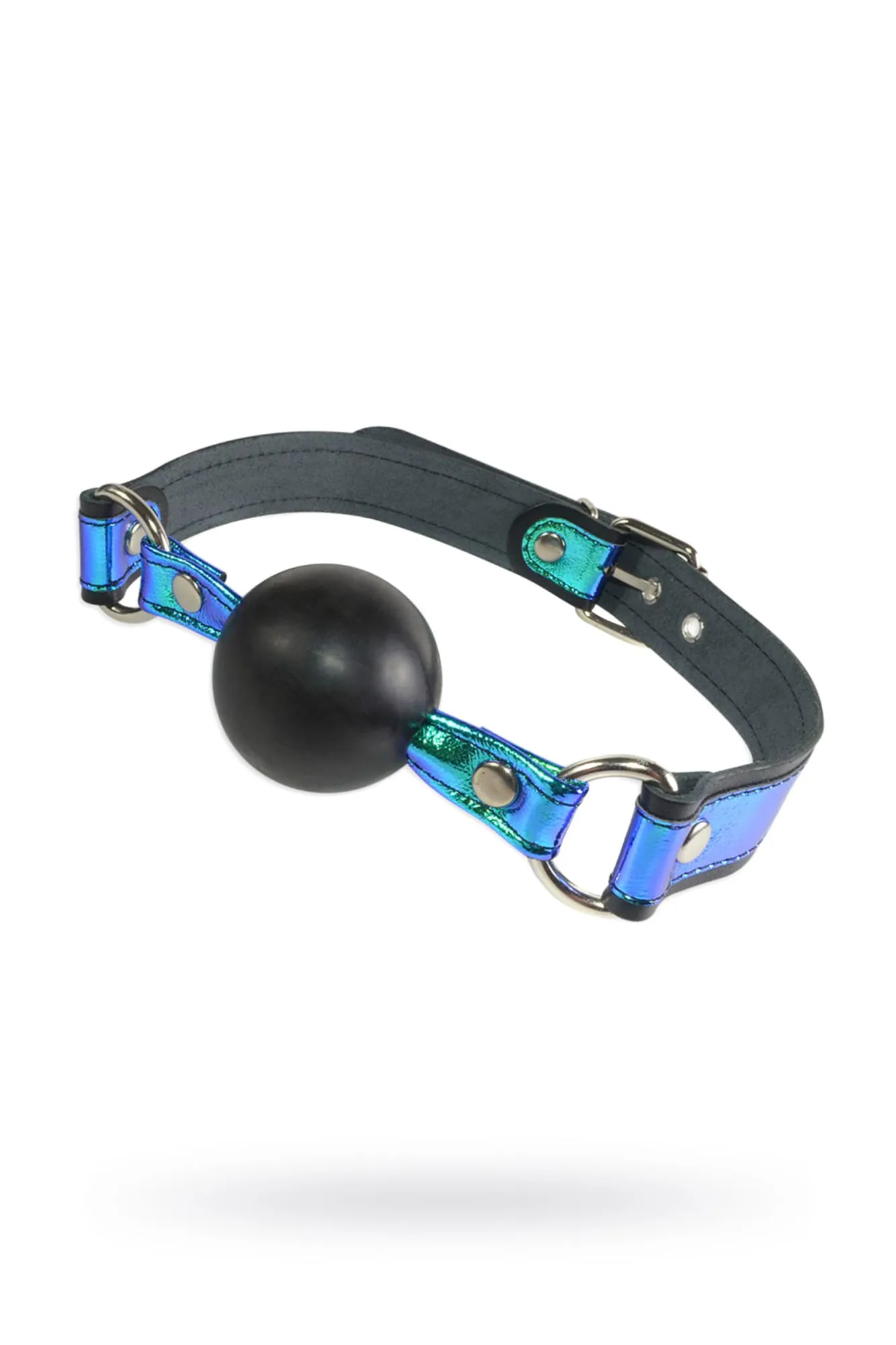 Эффектный девайс от Ситабелла в виде сферического кляпа с яркими ремешками из натуральной высококачественной кожи чёрного цвета, сделает ролевые игры особенно страстными и запоминающимися. Ремешки кляпа декорированы голографическими вставками синего цвета, который отливает изумрудным, салатным и бирюзовыми оттенками. Кляп «хамелеон», сделает Ваш образ неповторимым и сексуальным, ведь так красиво Вам ещё не закрывали рот! Кляп-шар не способен повредить зубы и прост в гигиеническом уходе, достаточно промыть теплой водой с мыльным раствором. Диаметр шара 4,5 см, длина ремешков 57 см, ширина 2,5 см. Легко зафиксировать девайс на шее и отрегулировать размер можно при помощи пряжки. Вся используемая фурнитура имеет хромированное покрытие.