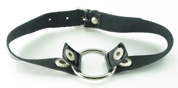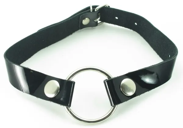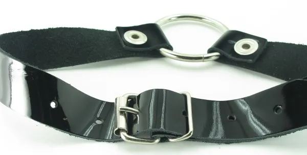 Кляп в виде открытого кольца на лаковом ремешке, изготовленном из качественной кожи (ширина ремня - 2 см) . Для регулировки длины кляпа на ремешке имеется 6 отверстий. Диаметр кольца - 4,5 см.