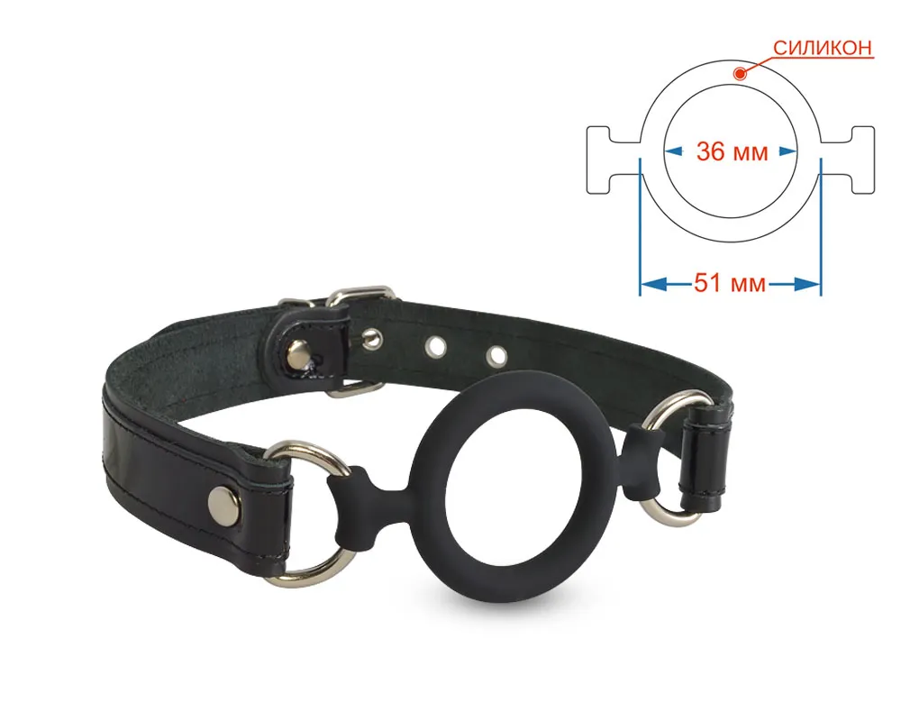 Силиконовый кляп-рамка прикреплен к ремешкам из натуральной кожи. Регулируется кляп при помощи металлической пряжки. Металлическая фурнитура имеет никелевое покрытие. Общая длина 59 см. Внешний диаметр 51 мм, внутренний 36 мм. Ширина ремешков 20 мм.