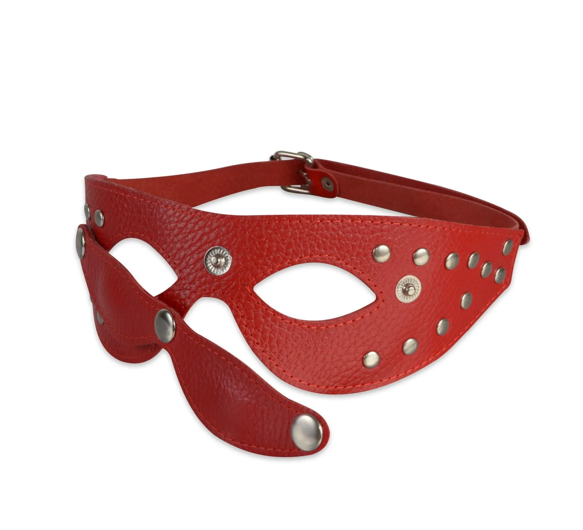 Маска выполнена из натуральной кожи красного цвета с велюровой подкладкой и декорирована металлическими клепками. Она подойдет как мужчинам, так и женщинам. Размер универсальный.