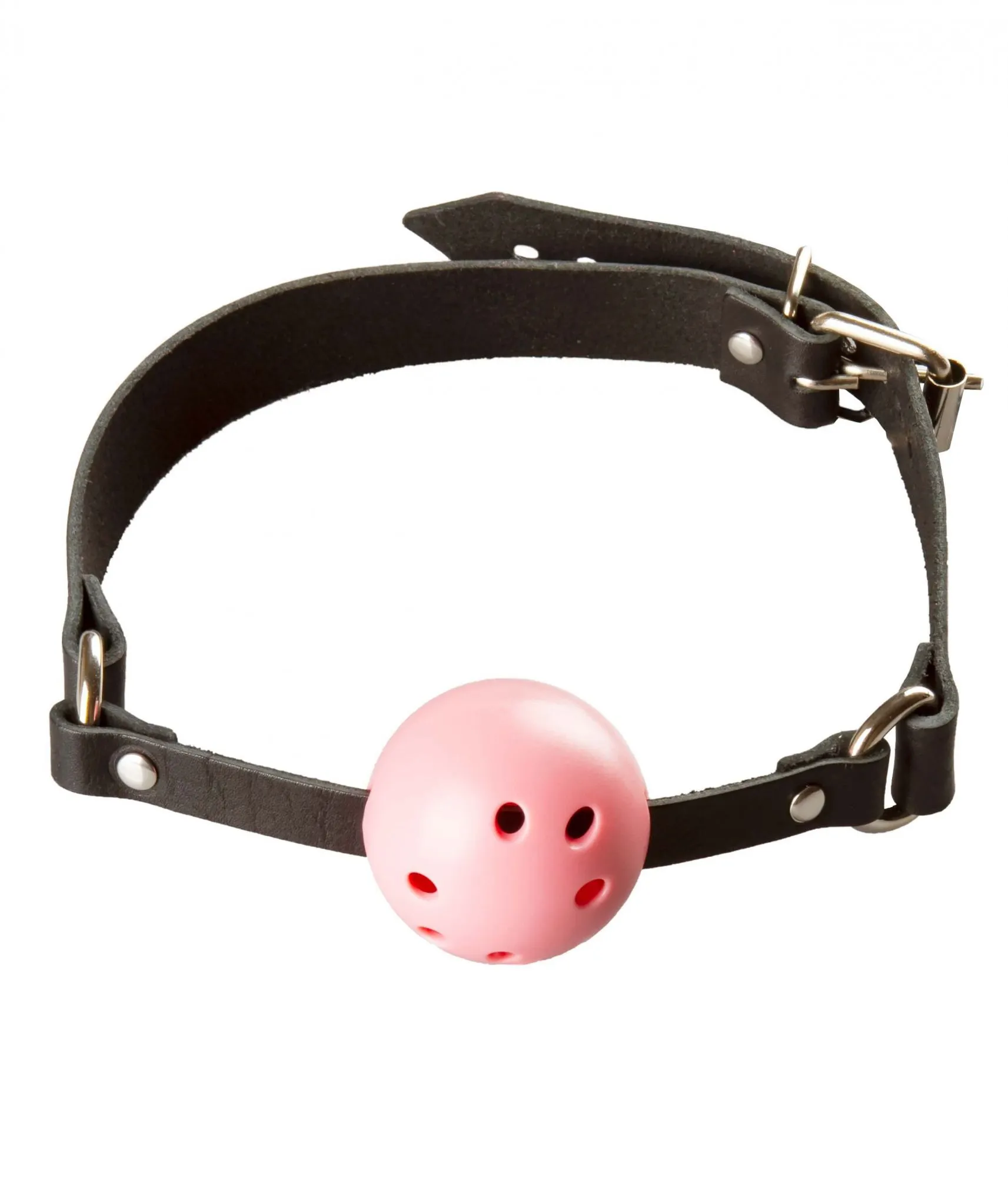 - Розовый шар на кожаном ремешке полностью закрывает рот.