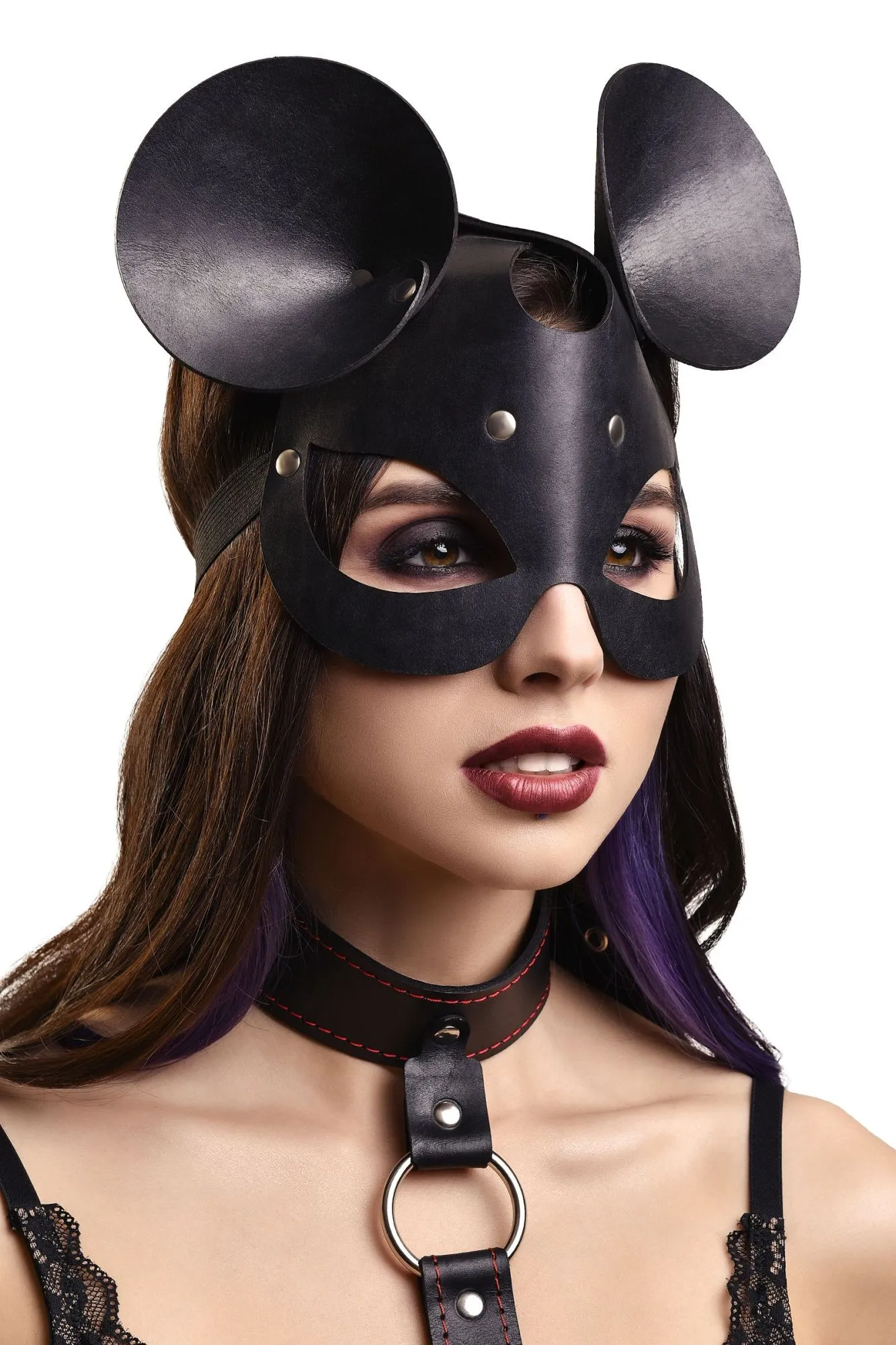 Маска Pecado BDSM, с ушками мышки, натуральная кожа, черный