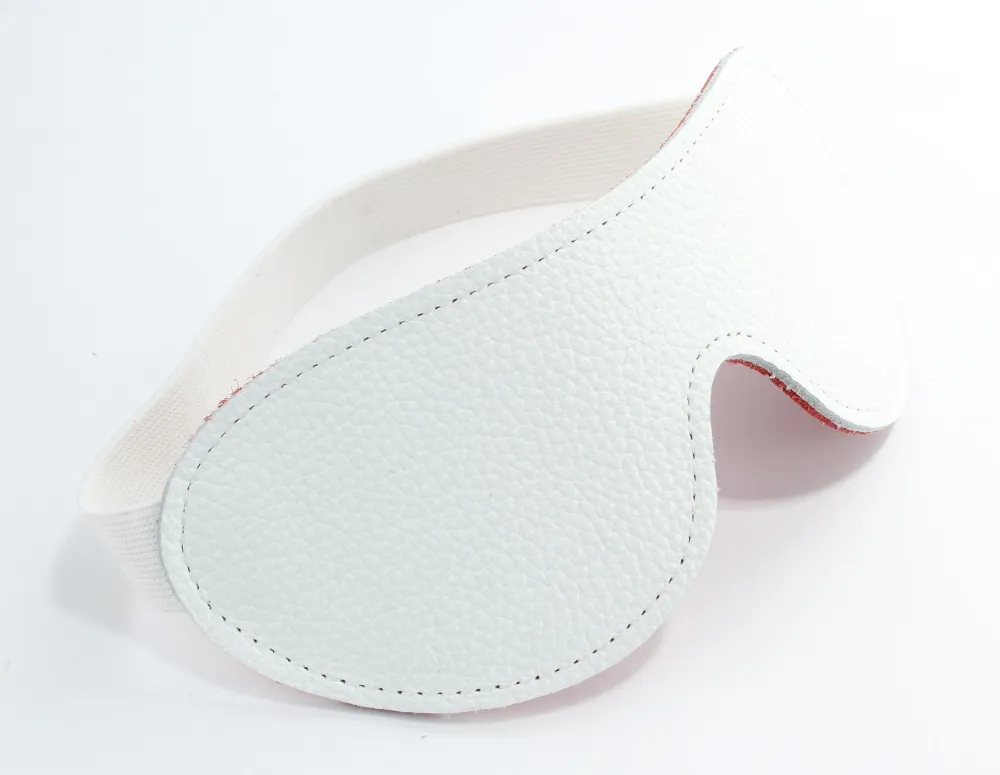 Белая маска изготовлена из кожи.Одна сторона белая , вторая сторона красная- мягкая приятная на ощупь кожа.Крепится на голове при помощи резинки. Длина маски-20 см.ширина - 7 см. Упаковка: картонная подложка.