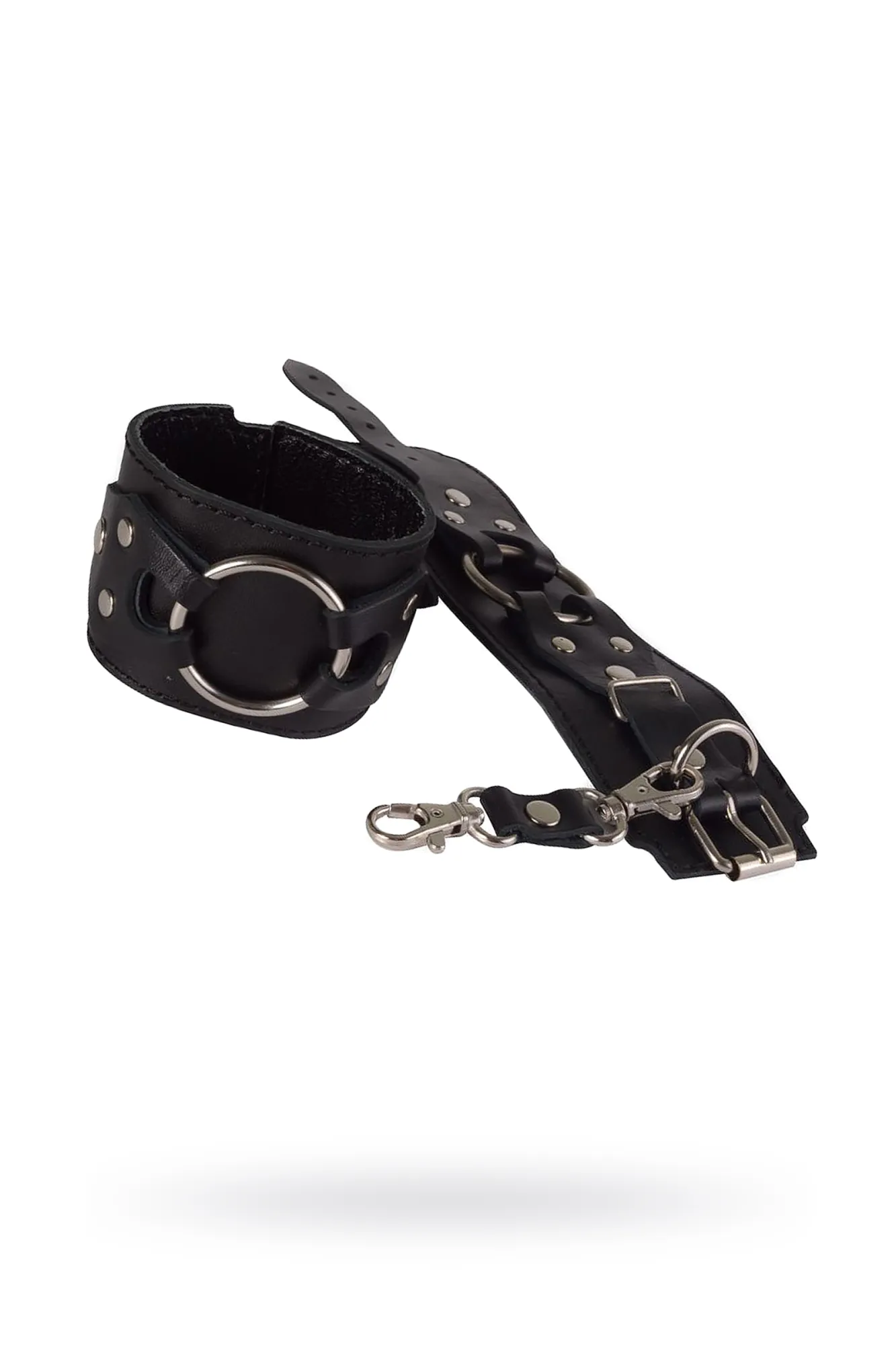 Черные наручники из натуральной кожи от Ситабелла помогут ограничить движения секс-партнёра, достаточно лишь одеть на запястья комфортный, но прочный девайс. Лаконичные, но при этом красивые наручники подойдут, как для женщин, так и для мужчин, т.к. размер легко регулируется при помощи металлической пряжки. Готические фигурные накладки, удерживающие большое металлическое кольцо, придают наручникам агрессивной сексуальности и роскоши. Соединяются наручники при помощи небольших карабинов, скреплённых кожаной перемычкой. Для комфортного использования внутренняя часть наручников выполнена из бархатистой велюровой кожи. Вся металлическая фурнитура имеет никелевое покрытие. Общая длина около 27 см Ширина 5,5 см