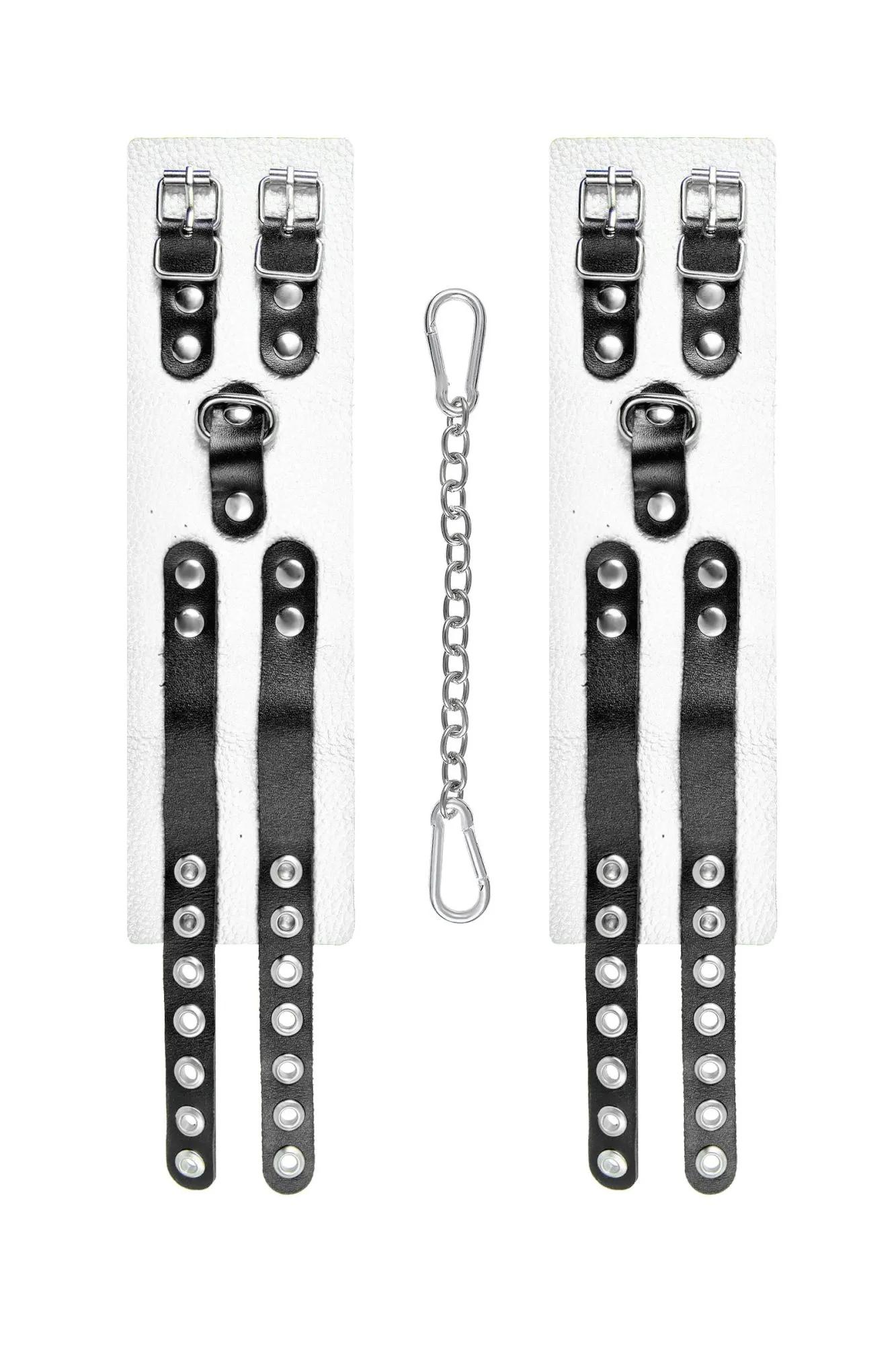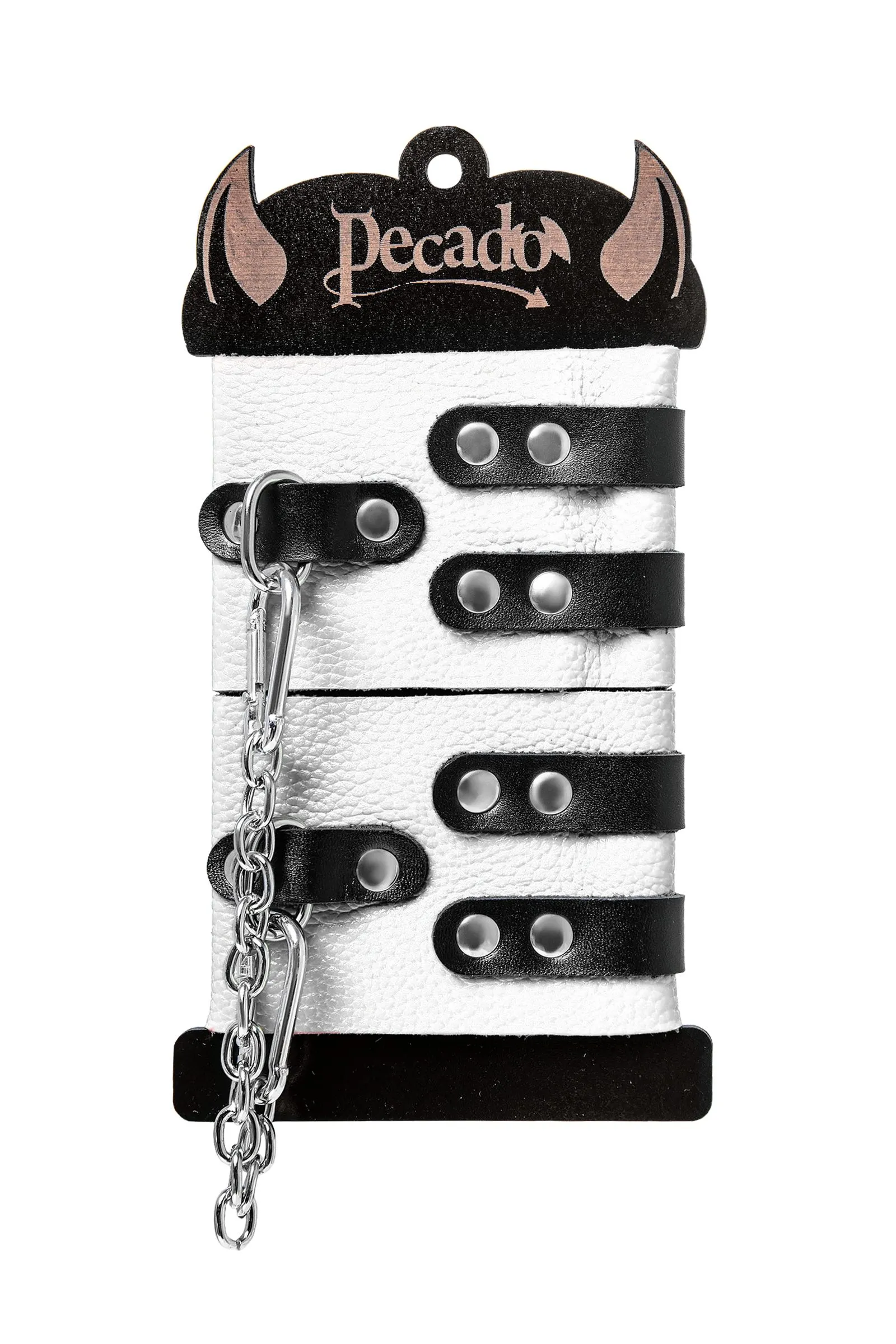 Мягкие оковы с двумя жёсткими ремешками от Pecado помогут обездвижить партнера во время сексуальных прелюдий или жестких БДСМ-играх. Оковы изготовлены полностью из белой, натуральной кожи. Ремешки выполнены из чёрной жёсткой кожи, украшены люверсами. Выделка материала произведена вручную. Ремешки и широкая манжета хорошо держат форму: не тянутся и не мнутся. Качественная металлическая фурнитура добавляет лоска изделию, а аромат натуральной кожи повышает градус возбуждения. Благодаря широкому запасу регулировок, можно подобрать необходимый обхват. Аксессуар удобно застегивать и легко расстегивать. При правильном использовании не оставляет следов на теле и не доставляет дискомфорта. Манжеты оков соединяются между собой помощью двух карабинов и съемной стальной цепочки. Подходит и для женских, и для мужских ног. ● 100% натуральная кожа. ● Ручная работа. ● Износостойкий, тактильно приятный материал. ● Надежная высококачественная фурнитура. ● Универсальный размер. ● Ширина манжет - 7см Длина манжет - 25см Длина сцепки - 20см