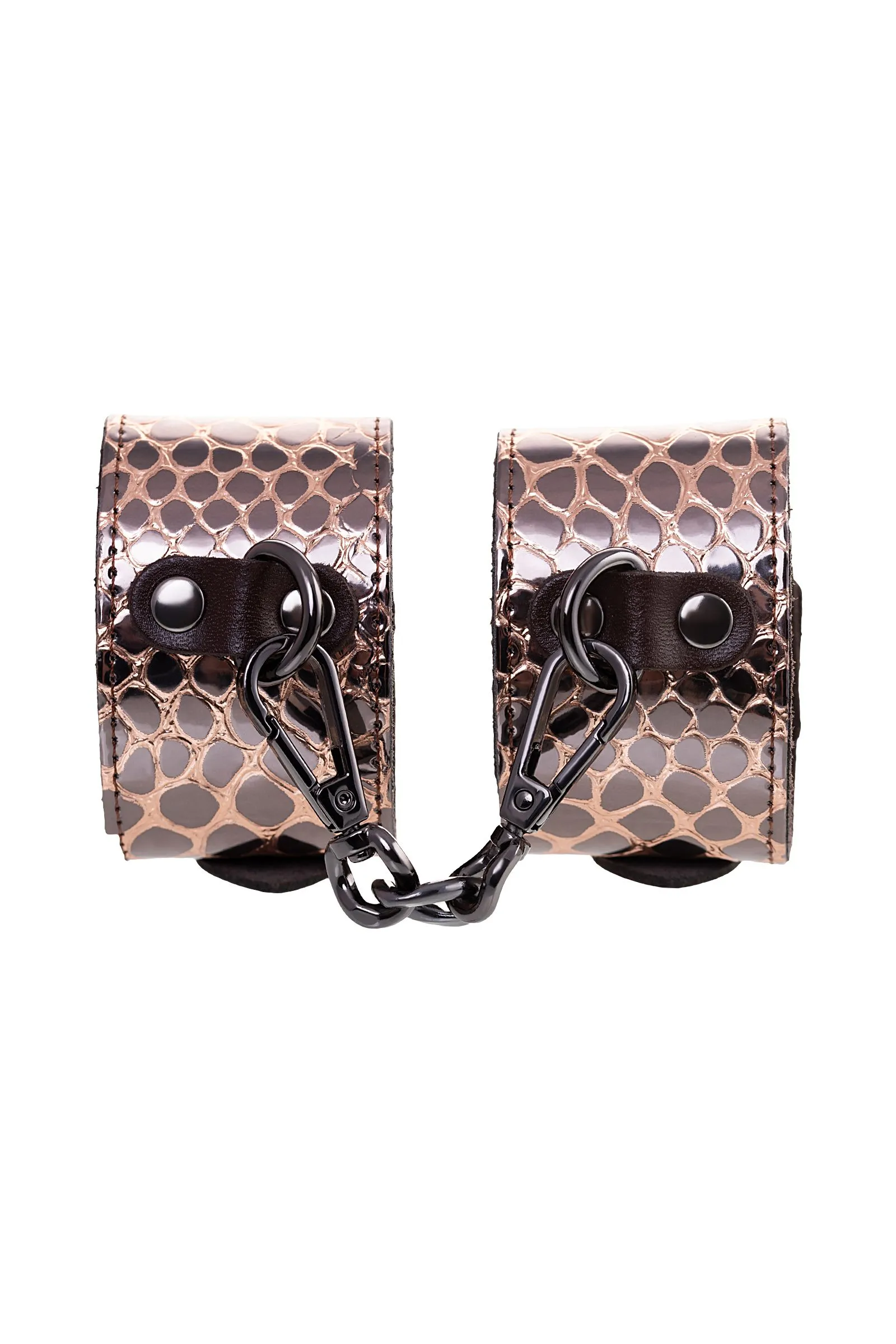 Наручники изготовлены из натуральной кожи. Регулируются при помощи металлических пряжек. Наручники соединяются карабинами. Общая длина 27 см. Ширина 4,6 см. ..
