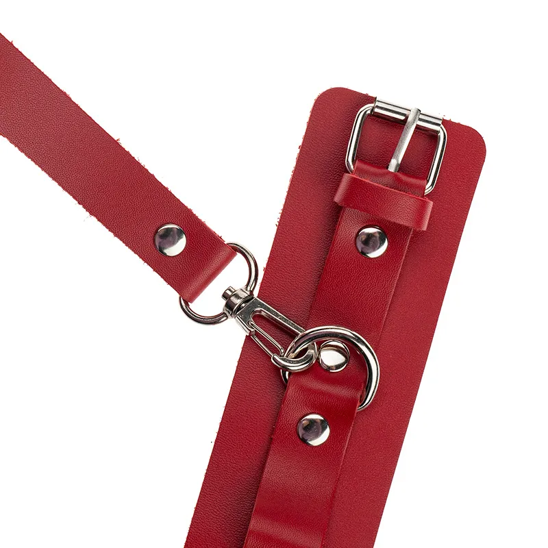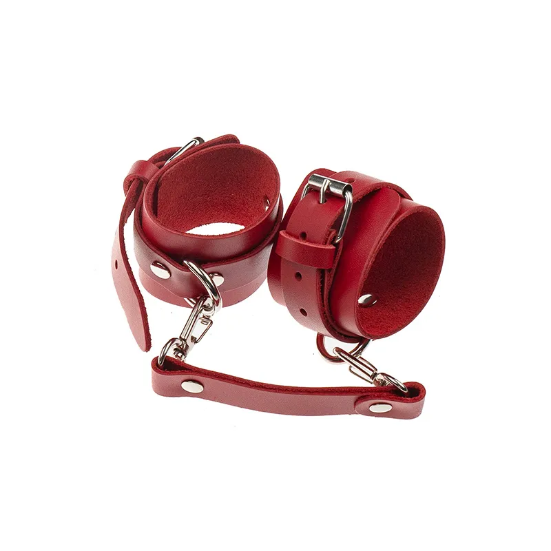 Теперь Доминант покажет, что значит грубое обращение и полный контроль над свободой. Красные наручники с металлической отделкой на самом деле твёрдо обхватывают руки и надежно соединяют их между собой коротким кожаным ремешком на карабинах. Предусмотрено место для крепления дополнительных аксессуаров. Можно придумывать разные варианты фиксации.