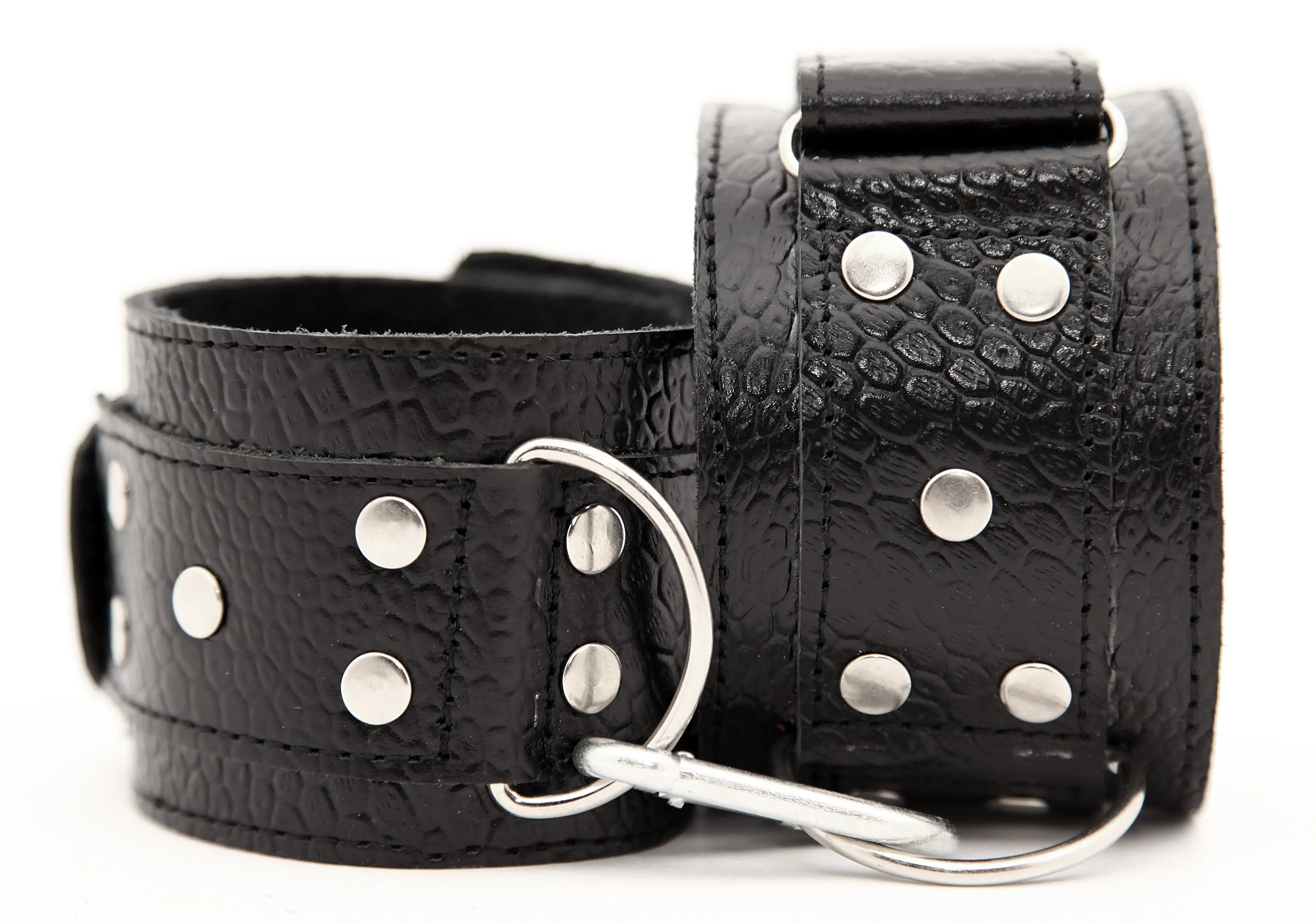 Кожаные наручники черного цвета. Ширина - 5 см. Украшены заклепками и соединяются между собой цепью с карабинами (длина цепочки - 15,5 см) Размер наручников регулируется при помощи застежки-липучки