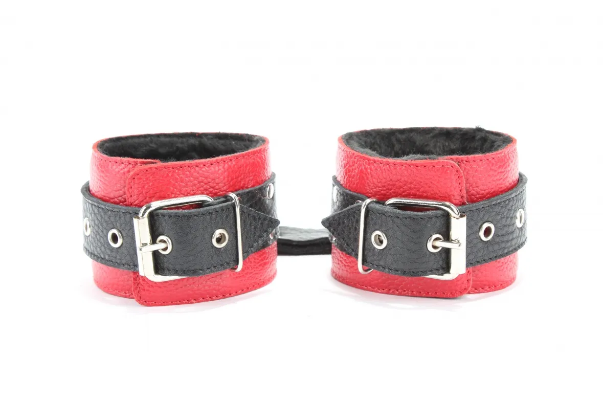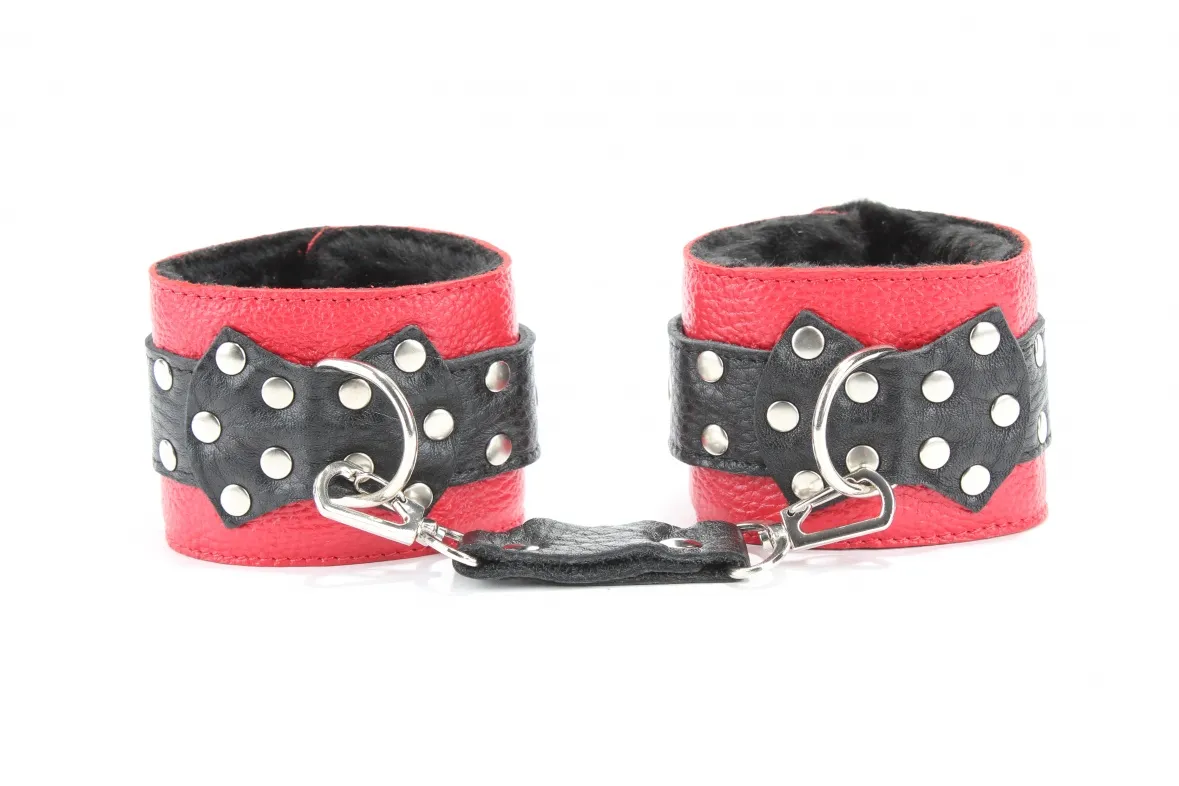 Кожаные наручники красного цвета.Ширина - 5 см. Украшены заклепками и соединяются между собой цепью с карабинами (длина цепочки - 15,5 см) Размер наручников регулируется при помощи застежки
