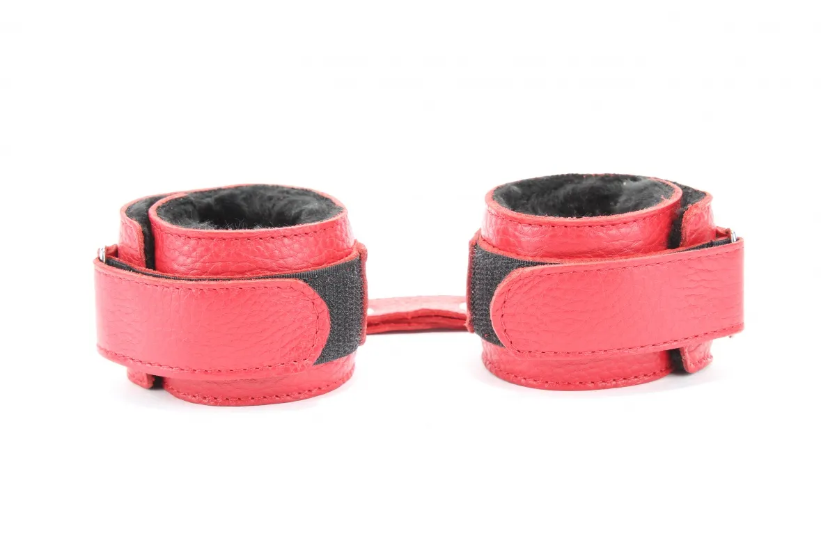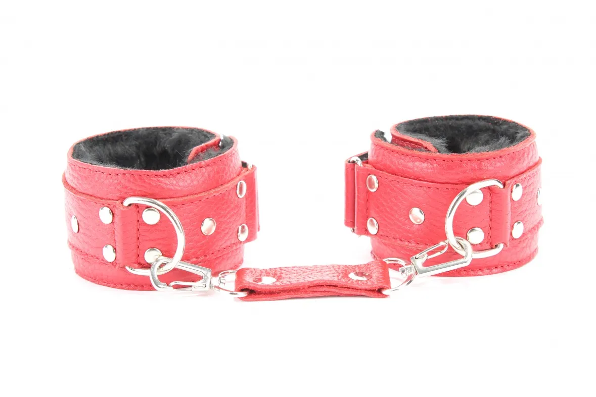 Кожаные наручники красного цвета. Ширина - 5 см. Украшены заклепками и соединяются между собой цепью с карабинами. Внутренняя часть наручников отделана черны мехом. Размер наручников регулируется при помощи застежки-липучки