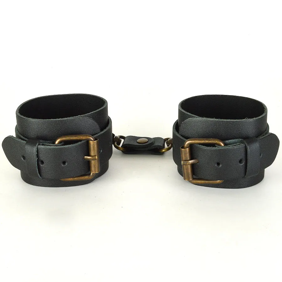 Наручники изготовлены из натуральной кожи черного цвета. Соединяются перемычкой с двумя карабинами. Длина основы 25 мм.  Длина узкого ремешка с пряжкой 31 см. Длина упаковки 16, ширина 13, высота 8 см. Вес брутто 161 г.