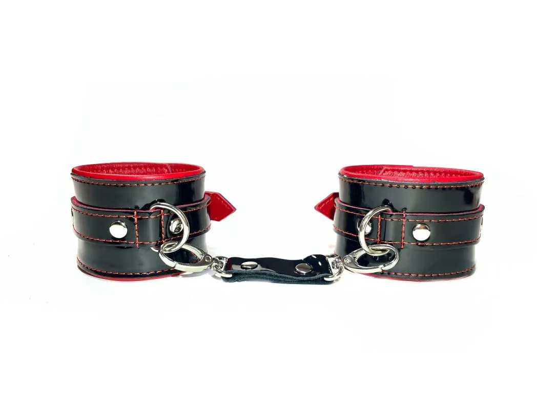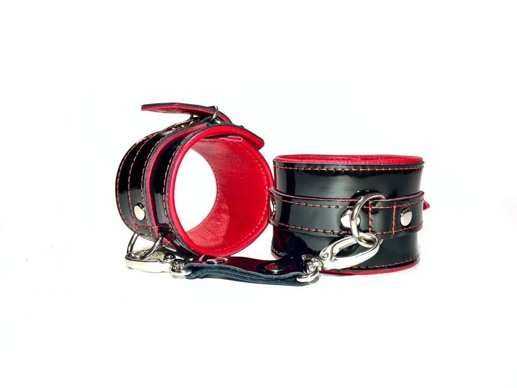 Наручники выполнены из черной натуральной лакированой кожи. Подклад изделия из нежнейшей красной овечьей кожи.Аксессуар декорирован металлическими заклёпками.Наручники надежно фиксируются пряжками и ремнями, позволяющими выбрать нужный размер,подойдут на обхват руки от 13 до 23см, ширина наручников 5,5см.Кожаное соединение на карабинах фиксирует наручники вместе, общая длина соединения 14см. На каждом аксессуаре два полукольца из сварной фурнитуры. Стильные наручники помогу воплотить эротические фантазии в реальность.