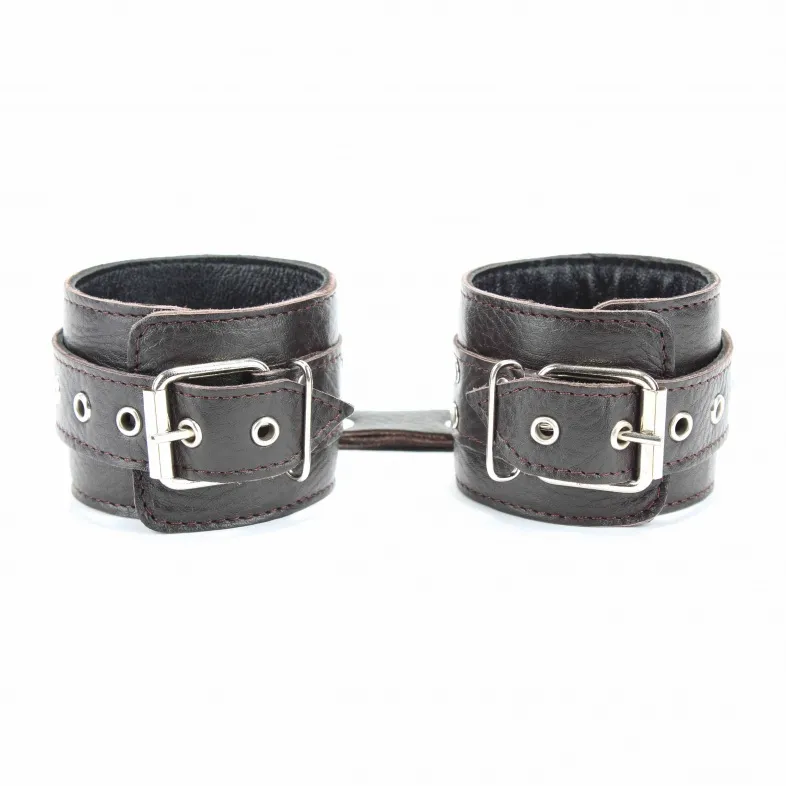 Кожаные наручники потрясающего коричневого цвета.Ширина - 6 см. Украшены заклепками и соединяются между собой цепью с карабинами (длина цепочки - 15см) Размер наручников регулируется при помощи застежки.