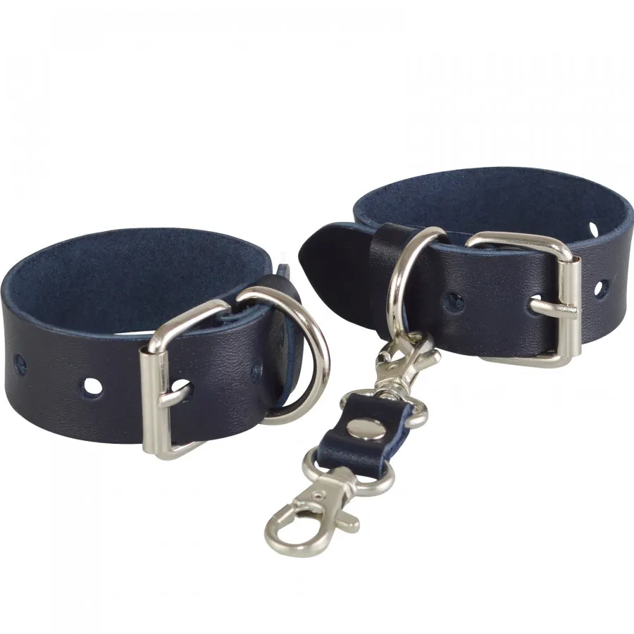 Аксессуар изготовлен из ременной кожи. Фурнитура никелированная. За счет регулирующей пряжки подойдут на любое запястье мужчин и женщин. Наручники имеют кожаную перемычку с двумя карабинами. Ширина браслета 25мм. Обхват минимальный 14см, максимальный 24см.