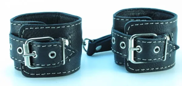 Оживить эротические игры Вам помогут наручники. Этот интимный аксессуар пользуется успехом у мужчин. Выполненные в черном цвете с белой отстрочкой и украшены прочными ремешками. Модный интимный аксессуар не сдавливает и не нарушает кровообращение, так как изготовлен из мягкой кожи. Чтобы любимая никуда не убежала, наручники соединены короткой перемычкой. Ширина оков - 6 см, длина оков- 26,5 см, длина перемычки – 6 см, производитель – BDSM Арсенал (Россия).