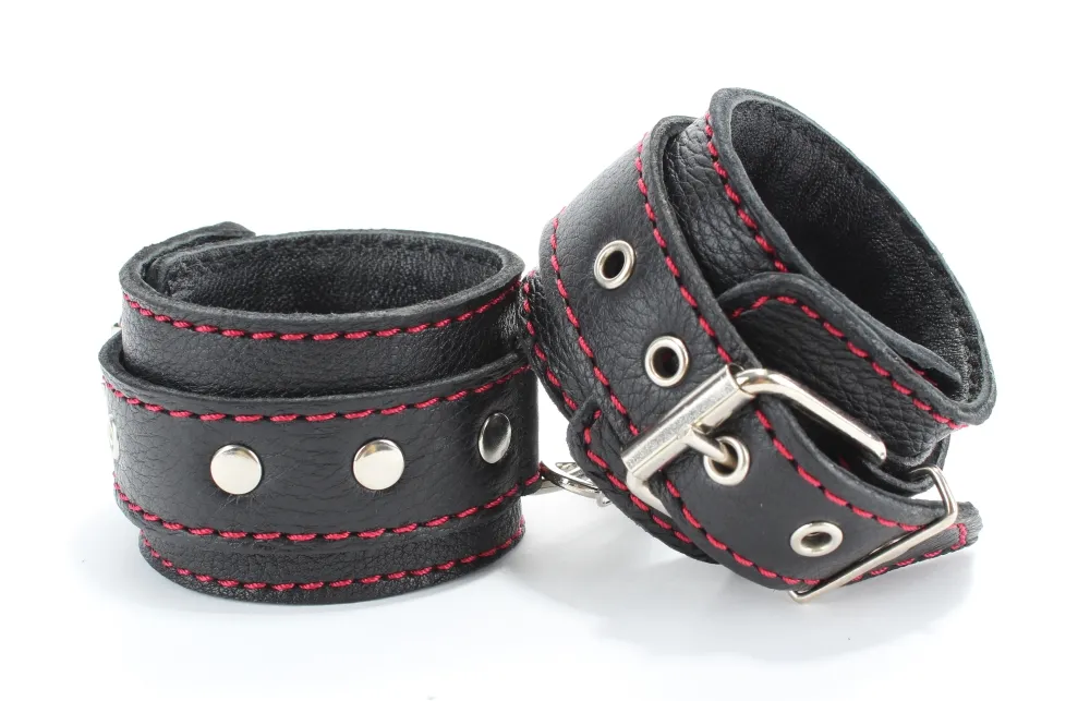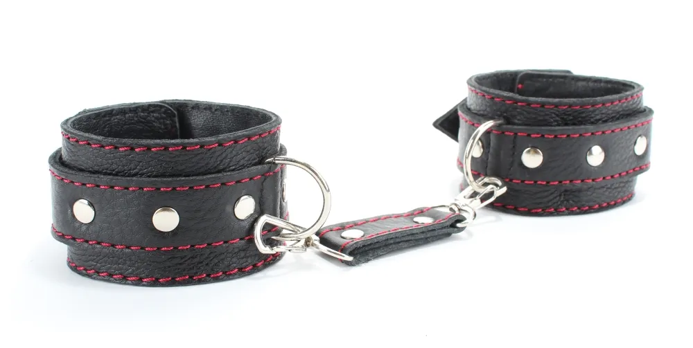 Оживить эротические игры Вам помогут поножи. Этот интимный аксессуар пользуется успехом. Выполненные в черном цвете с красной строчкой и декорированы заклепками. Модный интимный аксессуар не сдавливает и не нарушает кровообращение, так как изготовлен из мягкой кожи. Чтобы любимая никуда не убежала, поножи соединены короткой перемычкой. Ширина оков - 5,см, длина оков- 27 см, длина перемычки – 6 см. Упаковка: картонная подложка.