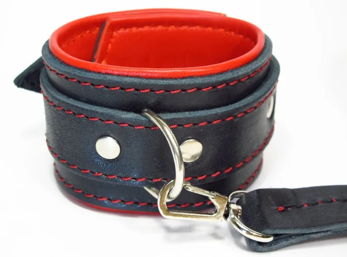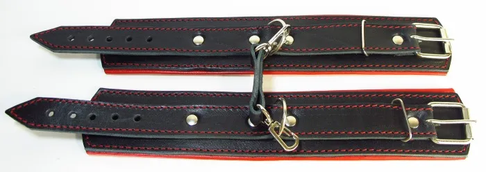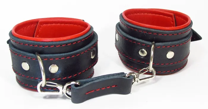 Оковы на руки с красным подкладом. Выполнены из толстой ременной кожи черного цвета, подклад мягкая перчаточная кожа ярко красного цвета. На пряжке. Использована усиленная металлическая фурнитура. Строчка толстой ниткой контрастного красного цвета.