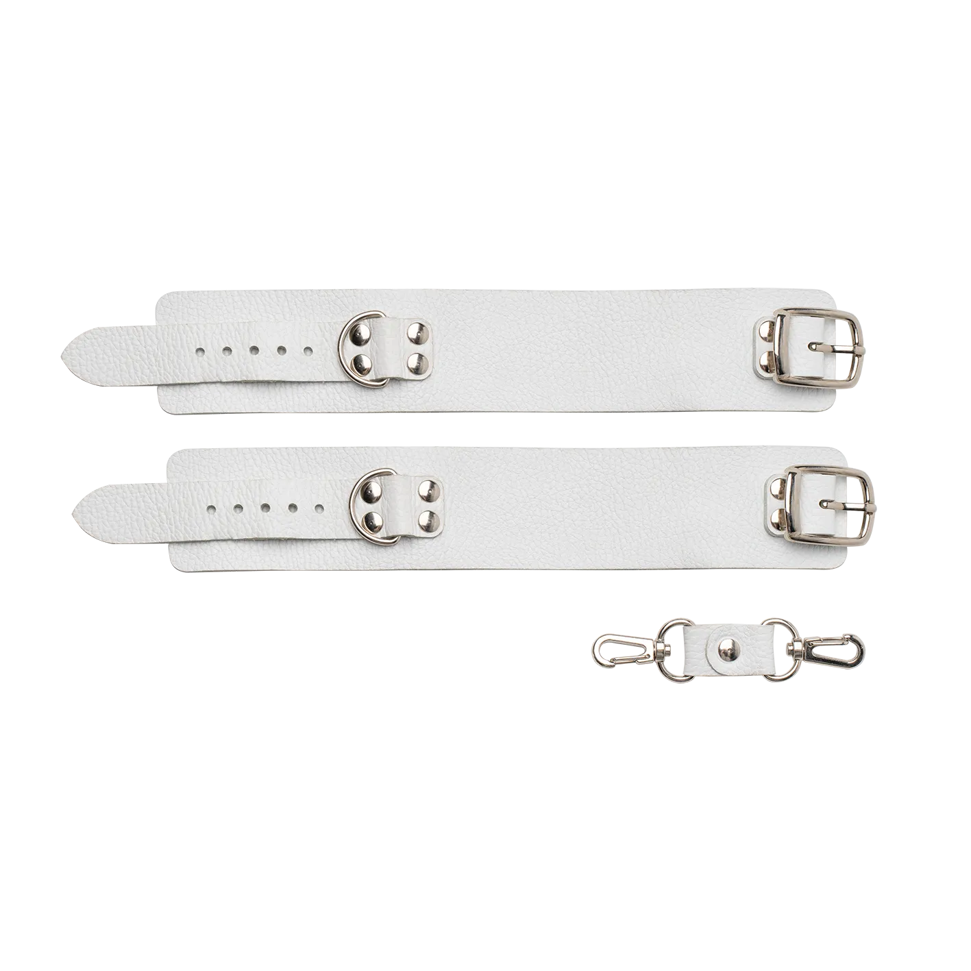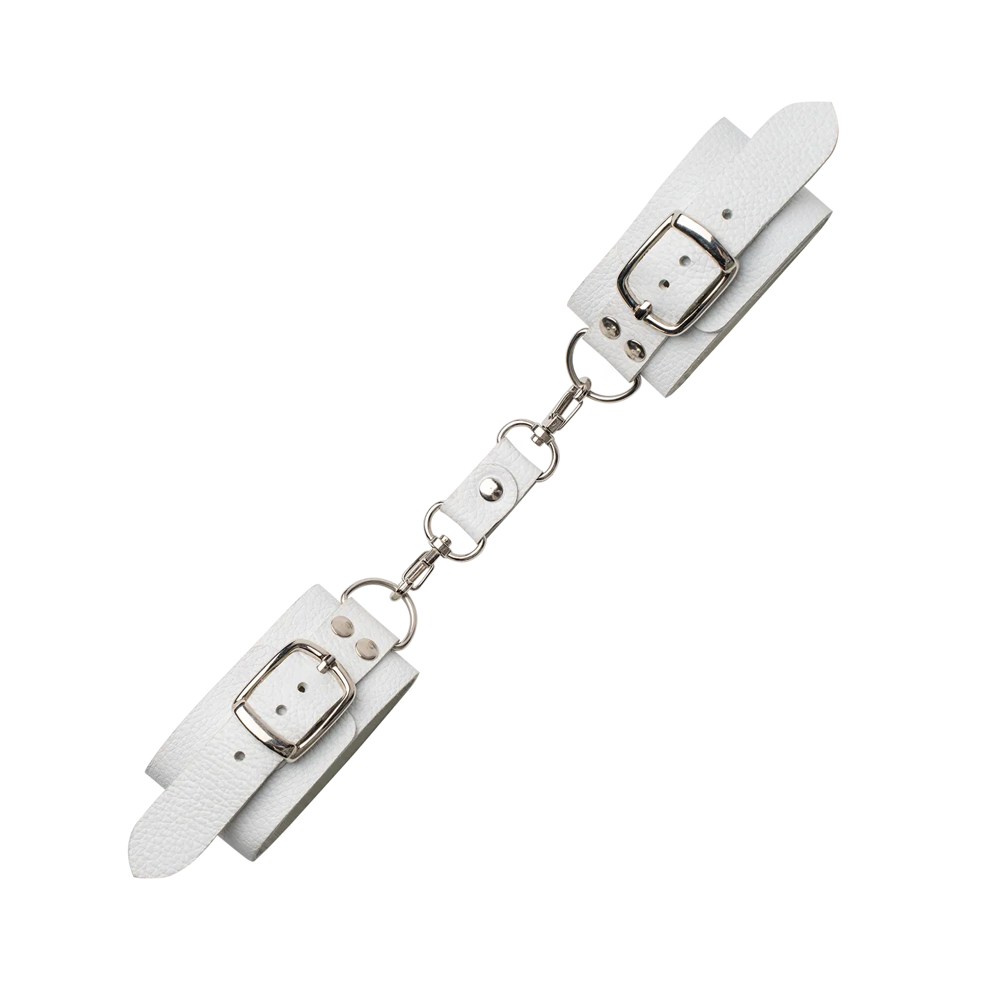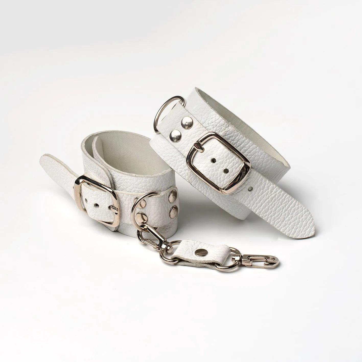 Наручники сделаны из натуральной кожи белого цвета и соединены между собой при помощи кожаной стяжки с карабинами. Такой аксессуар позволит Вам обездвижить руки своего партнера, лишив его возможности сопротивляться и препятствовать Вашим ласкам. Невозможность двигать руками обострит все чувства партнера, делая его особенно чувствительным ко всем прикосновениям. Наручники разнообразят Ваши интимные игры и позволят испытать новые ощущения во время секса.