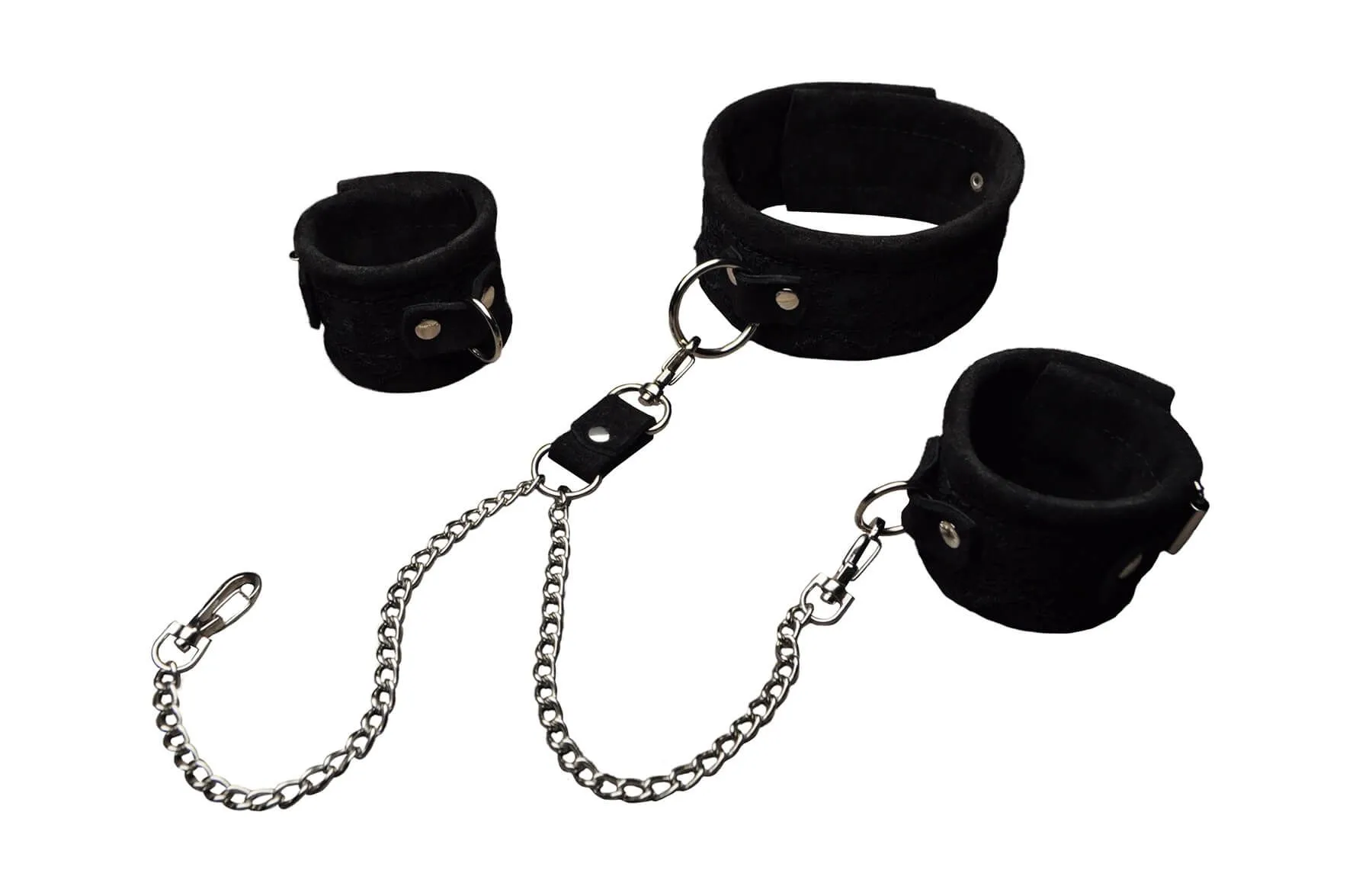 Между собой наручники и ошейник соединяются стяжкой с двумя цепочками. Размер регулируется при помощи ремешков с пряжками.