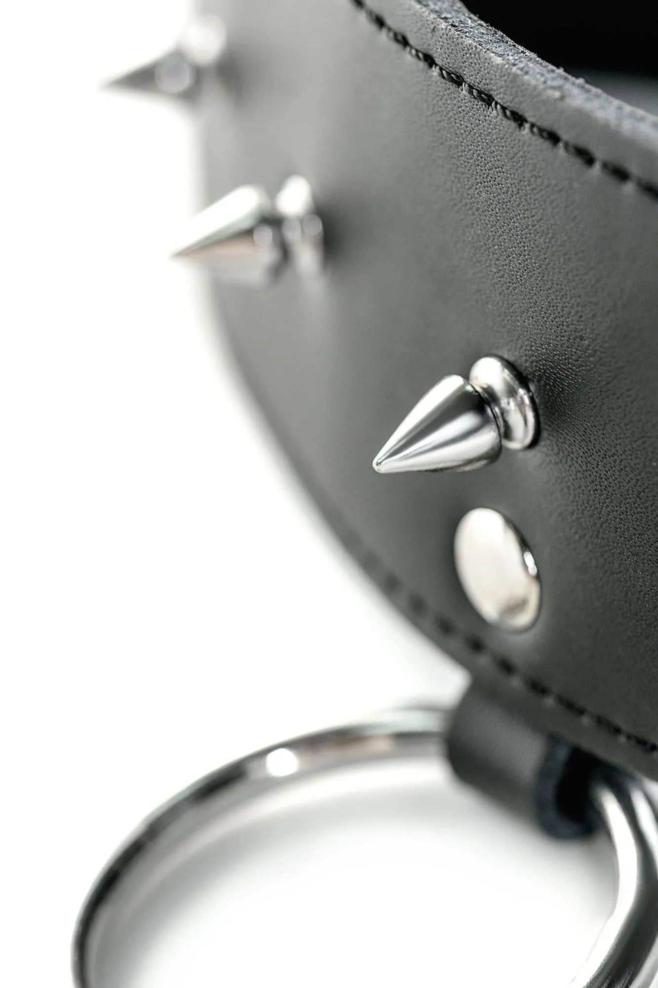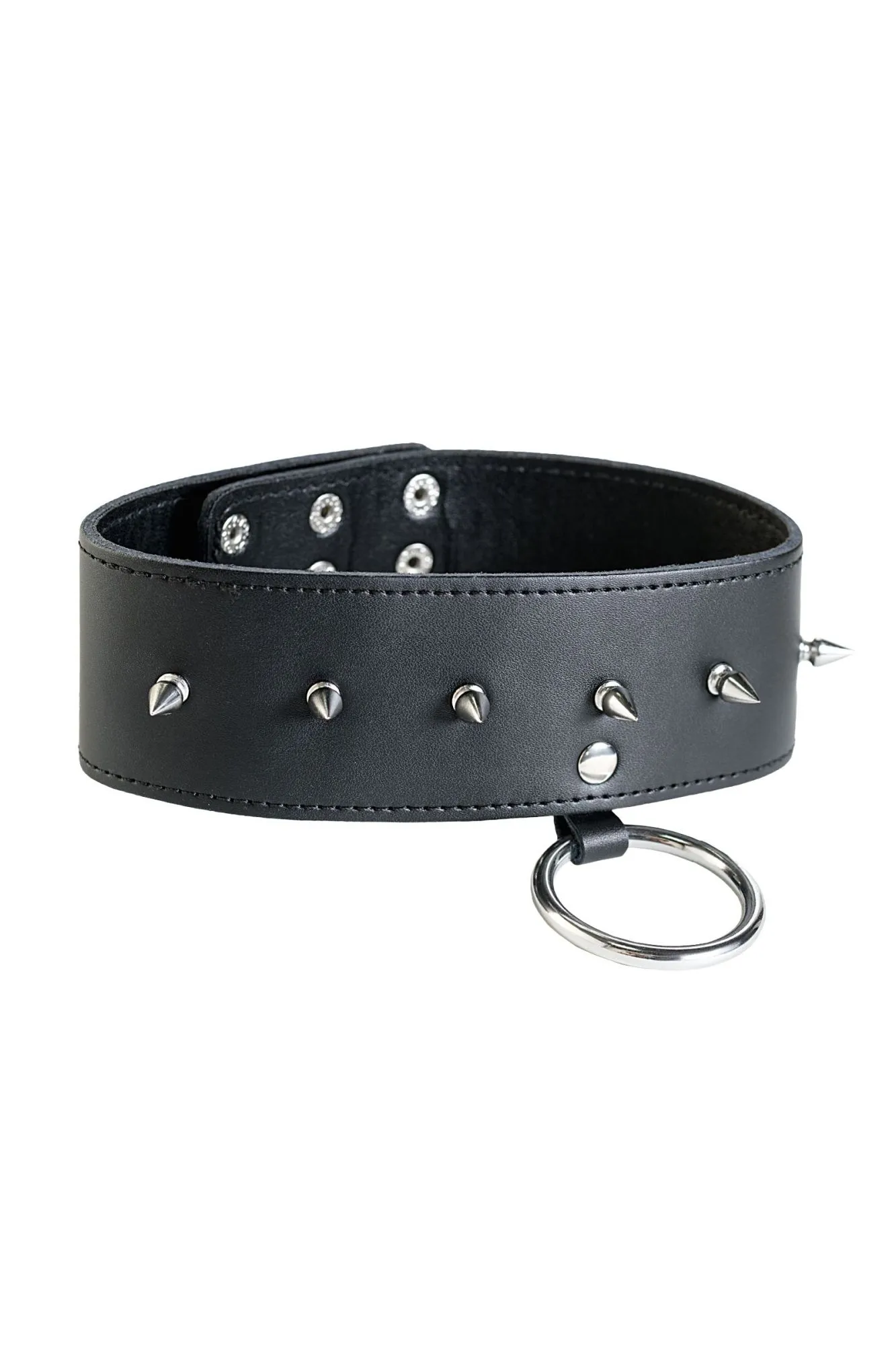 Ошейник из нежной чёрной кожи с декоративными шипами и металлическими кнопками — девайс, который придаёт интригующую агрессивность и некую брутальность образу. Размер регулируется тремя рядами кнопок. А с помощью имеющегося кольца можно прицепить поводок. С таким ошейником интимные игры достигнут нового уровня удовольствия!