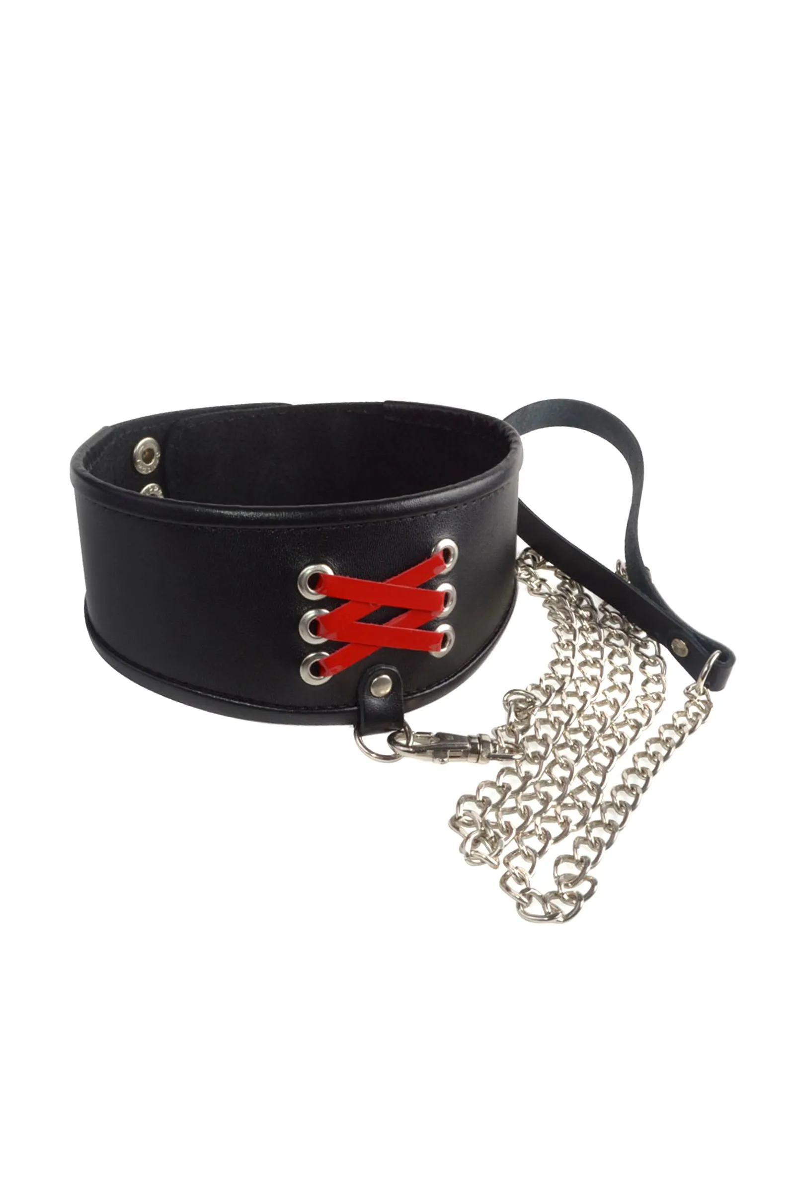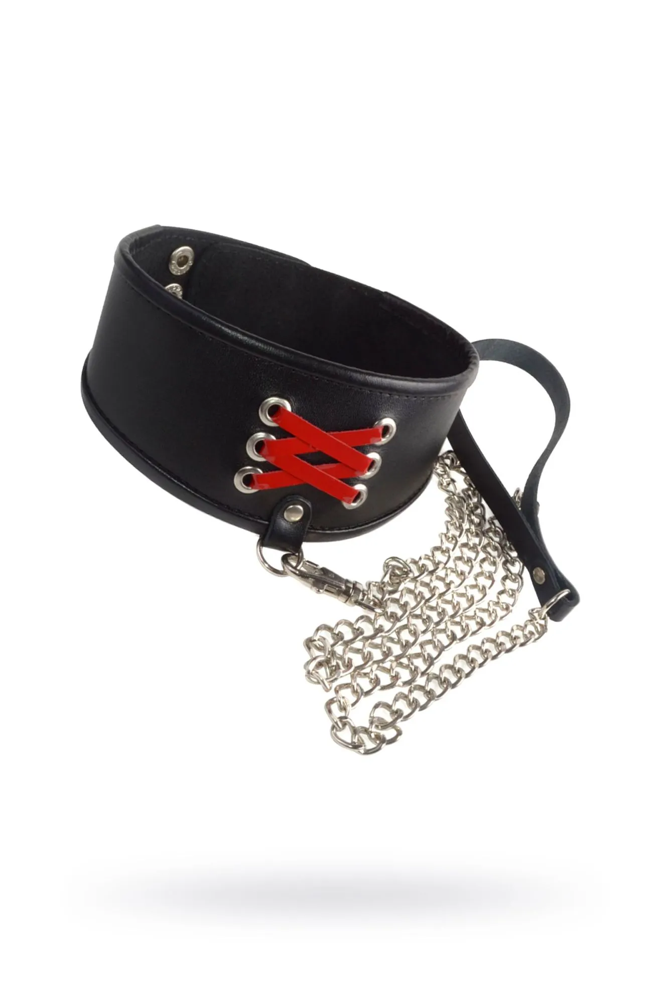 Для любителей ролевых игр Ситабелла представляет широкий ошейник из натуральной кожи. Высококачественный материал, из которого изготовлен девайс, гарантирует комфортное и долгосрочное использование. Лицевая сторона из чёрной кожи в сочетании с переплётом из красных лаковых лент, напоминает корсет, который плотно обхватит шею Вашего партнёра. Для комфортного ношения, изделие имеет подкладку и обработанный оторочкой край по всему периметру ошейника. Эргономичность изделия основана, на том, что ошейник более широкий спереди, но сужается к зоне крепления, это не ограничивает движение. Длина ошейника составляет 43 см, максимальная ширина 7 см. Зафиксировать на шее и отрегулировать размер можно при помощи кнопок. В паре с ошейником идёт поводок-цепочка, что позволит держать партнёра на необходимом расстоянии. С одной стороны цепочки располагается карабин для крепления к ошейнику, с другой, кожаный ремешок-петля, который для удобства можно разместить на запястье. Общая длина поводка около 1 м.