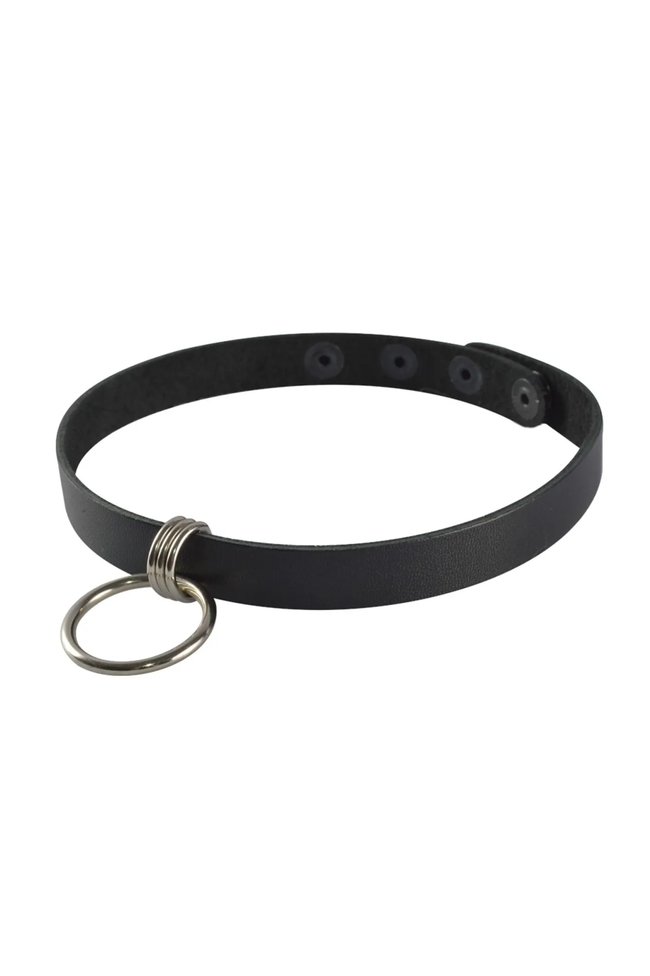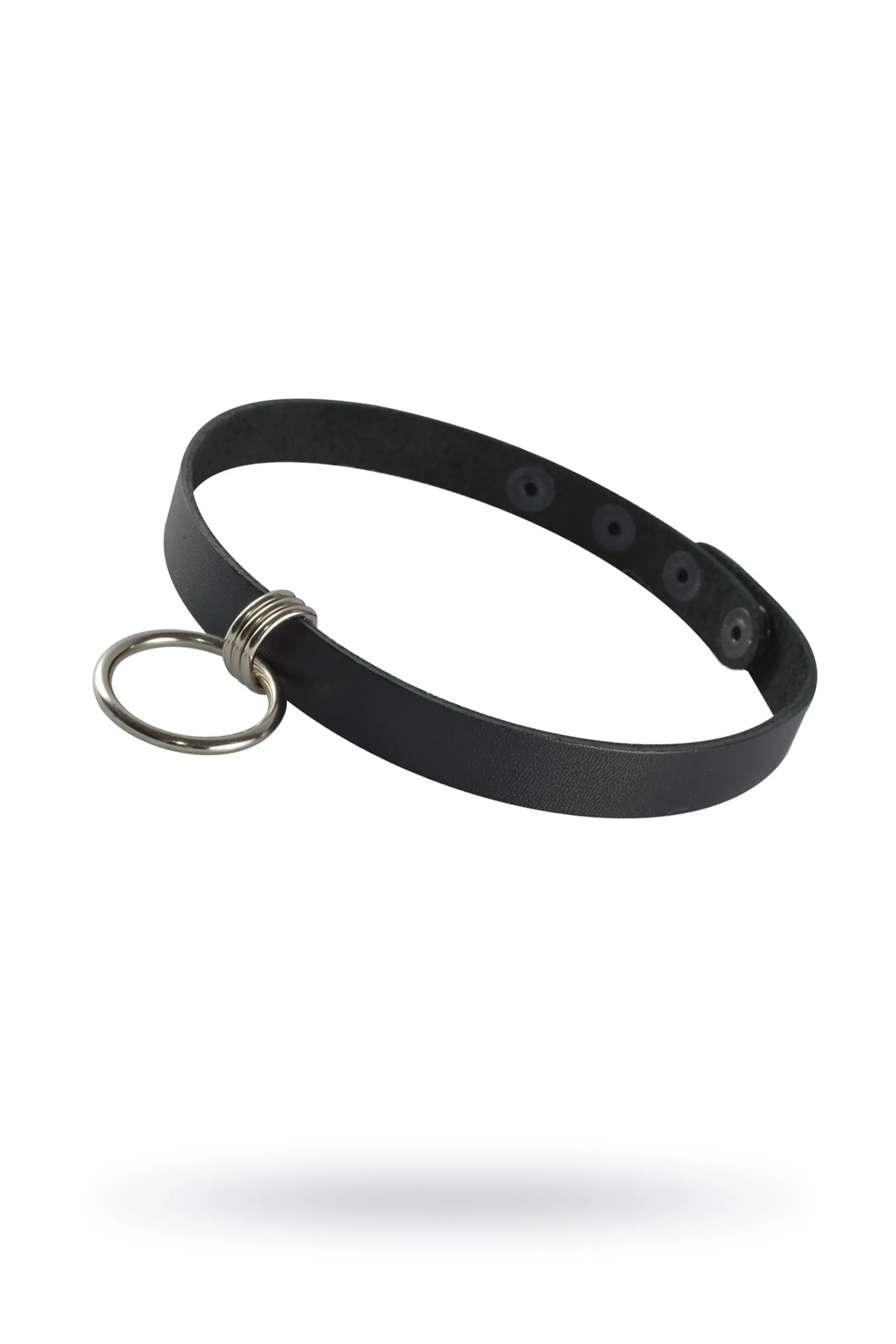 Чокер из натуральной кожи черного цвета, украшен подвесным металлическим кольцом. Регулируется при помощи кнопок. Длина изделия 40 см, ширина 1,5 см. Металлическое кольцо имеет никелевое покрытие