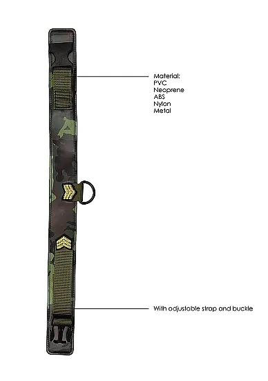 Ошейник Army Theme – выполненный в необычном стиле атрибут подчинения для эротических ролевых игр и практик БДСМ. На внешней части внизу ошейника имеется небольшое D-образное колечко, за которое можно зацепить входящий в комплект поводок.