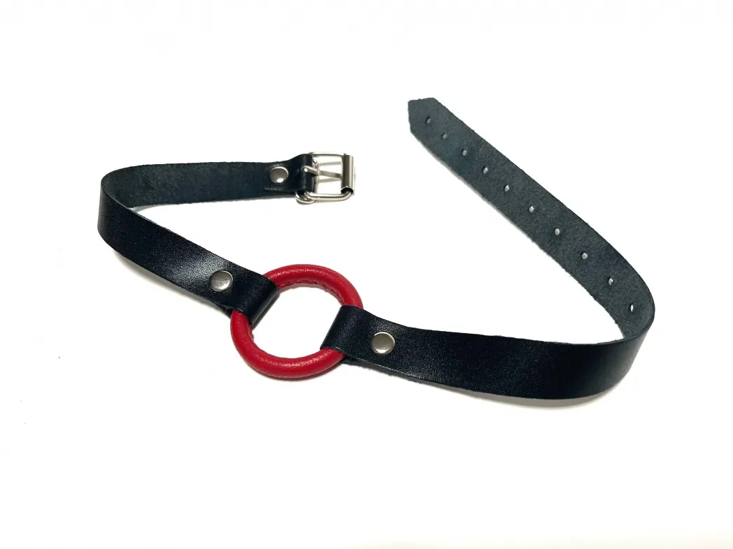 Строгий и надежный кляп, выполненный из натуральной кожи черного цвета. В основании использовано сварное металлическое кольцо диаметром 4,5 см, обтянутое нежной овечьей кожей красного цвета. Ширина ремешков 1,8см, обхват удобно регулируется с помощью металлической пряжки. Такой кляп станет отличным элементом БДСМ игры, функциональным и комфортным в использовании. Материал: натуральная кожа, металл Цвет: черный, красный