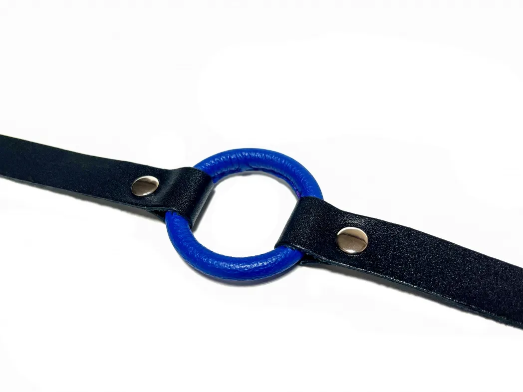 Строгий и надежный кляп, выполненный из натуральной кожи черного цвета. В основании использовано сварное металлическое кольцо диаметром 4,5 см, обтянутое нежной овечьей кожей синего цветж. Ширина ремешков 1,8см, обхват удобно регулируется с помощью металлической пряжки. Такой кляп станет отличным элементом БДСМ игры, функциональным и комфортным в использовании. Материал: натуральная кожа, металл Цвет: черный, синий