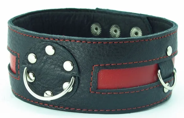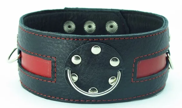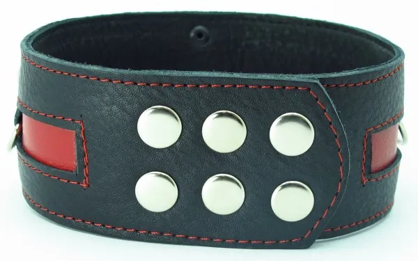 Черный кожаный ошейник с красной кожаной вставкой Имеет три кольца для карабинов, два ряда заклепок-застежек. Ширина ошейника - 5см. Размер регулируется.