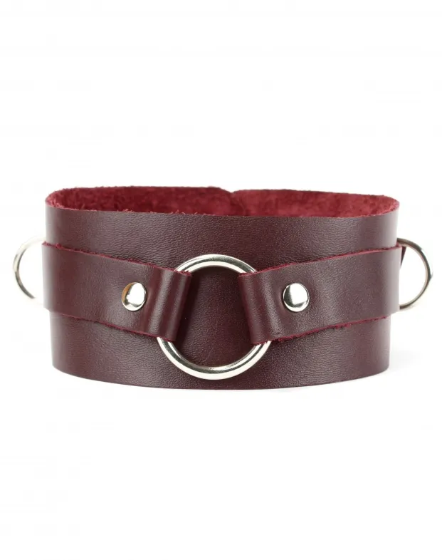 Ошейник сделан из мягкой натуральной кожи бордового цвета. Впереди высокая стойка декорирована металлическим кольцом, размер ошейника регулируется пряжкой сзади. Стильный аксессуар разнообразит любую БДСМ игру!