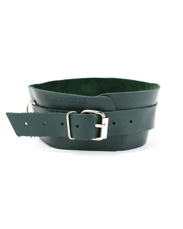 Ошейник сделан из мягкой натуральной кожи изумрудного цвета. Впереди высокая стойка декорирована металлическим кольцом, размер ошейника регулируется пряжкой сзади. Стильный аксессуар разнообразит любую БДСМ игру!