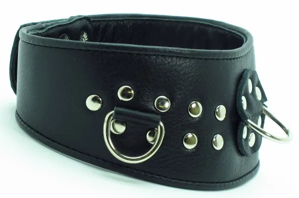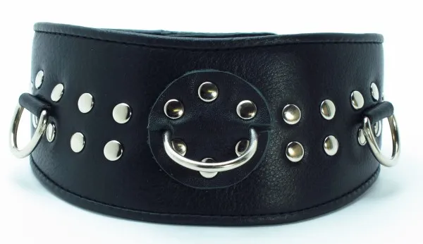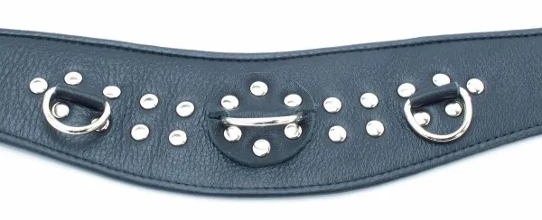 Черный кожанй ошейник с  заклепками. Имеет три кольца. Ширина -4 см, макс. ширина - 6 см., размер регулируется при помощи застежек-кнопок.