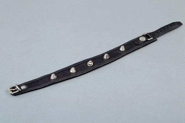 Ошейник выполнен из натуральной кожи и имеет анатомический изгиб. Он украшен декоративными металлическими заклепками, посередине у него есть кольцо, к которому можно прикрепить поводок или различные бондажные системы. Застегивается на ремень с пряжкой.