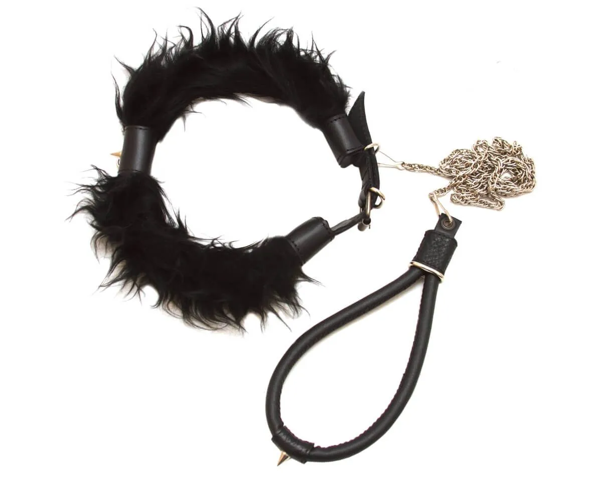 —Ошейник меховой с поводком, чёрный