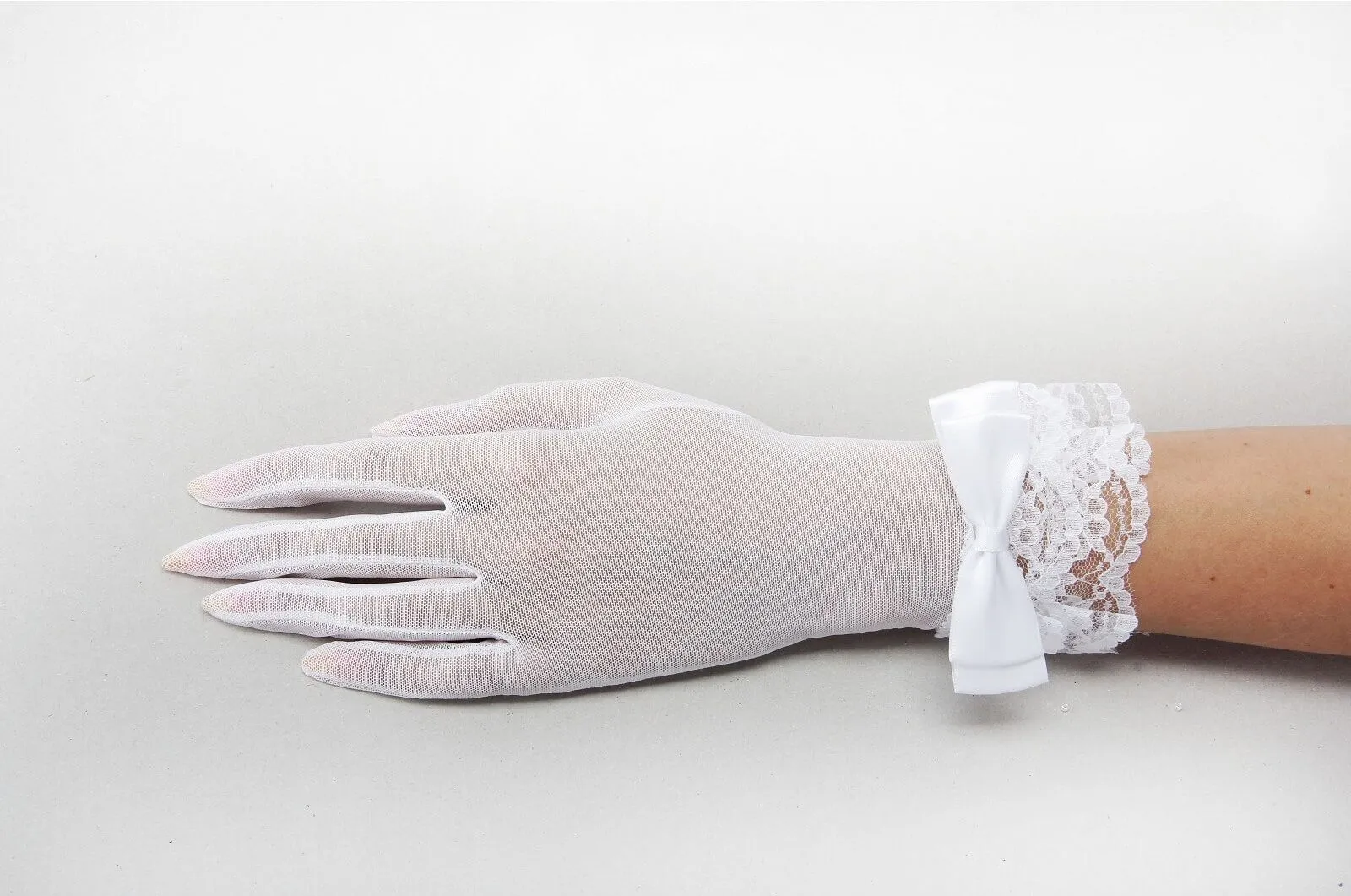Короткие перчатки невесты с бантом выполнены в белом цвете, а ведь белый - это синоним слова элегантность. Идеально подобранные перчатки свидетельствуют об отменном вкусе невесты. Помните, что короткие перчатки подходят к платьям с рукавами! Вы только представьте, как изящно будет выглядеть Ваш образ: фата, свадебное платье с рукавчиком и изящные перчатки до запястья, а такое «свадебное совершенство» дополнит букет невесты.