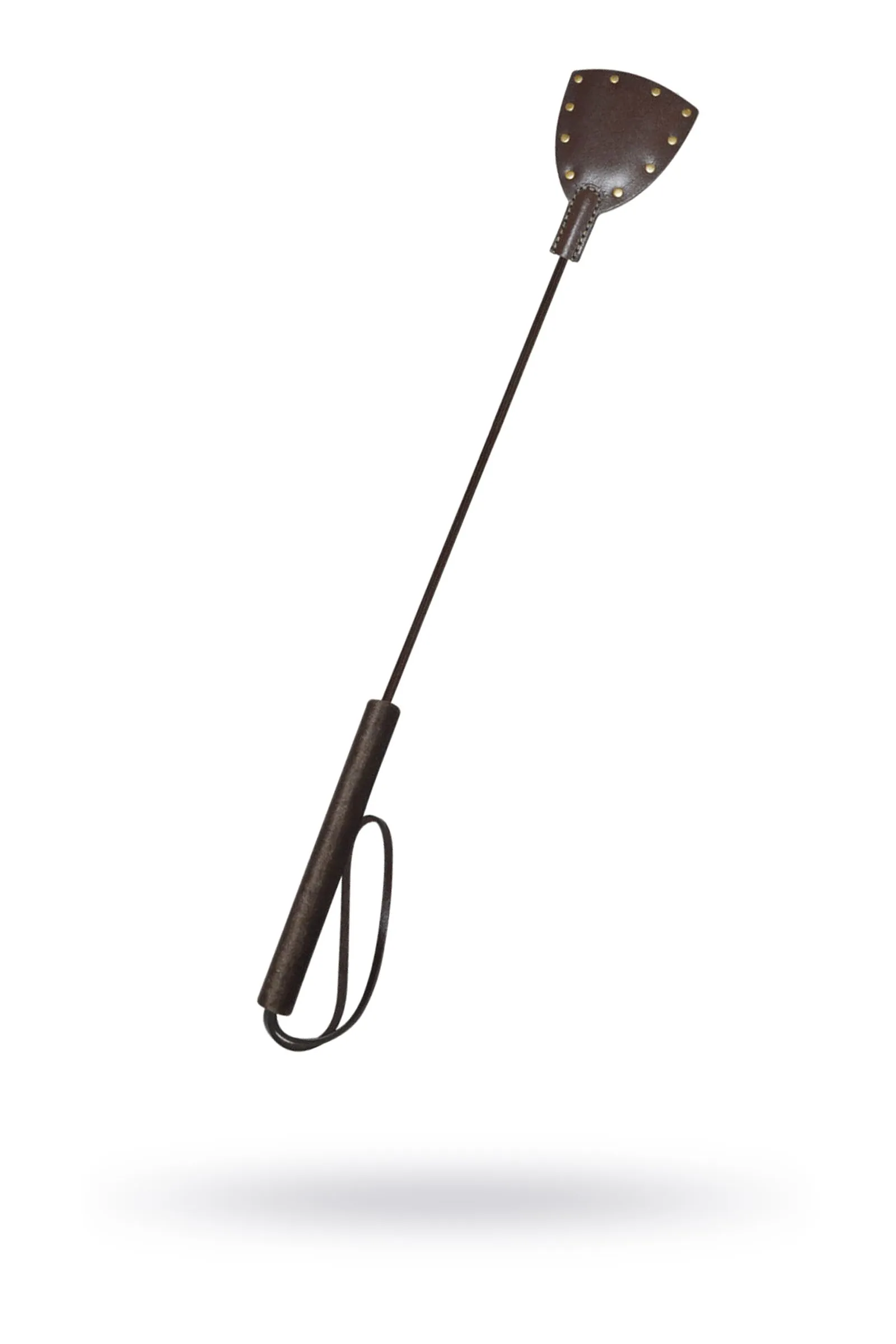 Стек из серии Готика представлен в виде роскошного, изящного изделия цвета темного шоколада. Основательная хлопушка стека изготовлена из натуральной кожи высокого качества и украшена большим количеством клёпок. Хлопушку и рукоять соединяет упругий, но прочный хлыст. Комфортное использование девайса обеспечивает бархатистая рукоять, покрытая велюровой тканью. Ремешок-петля, находящийся на рукояти, позволяет дополнительно фиксировать стек на запястье.ксировать стек на запястье.